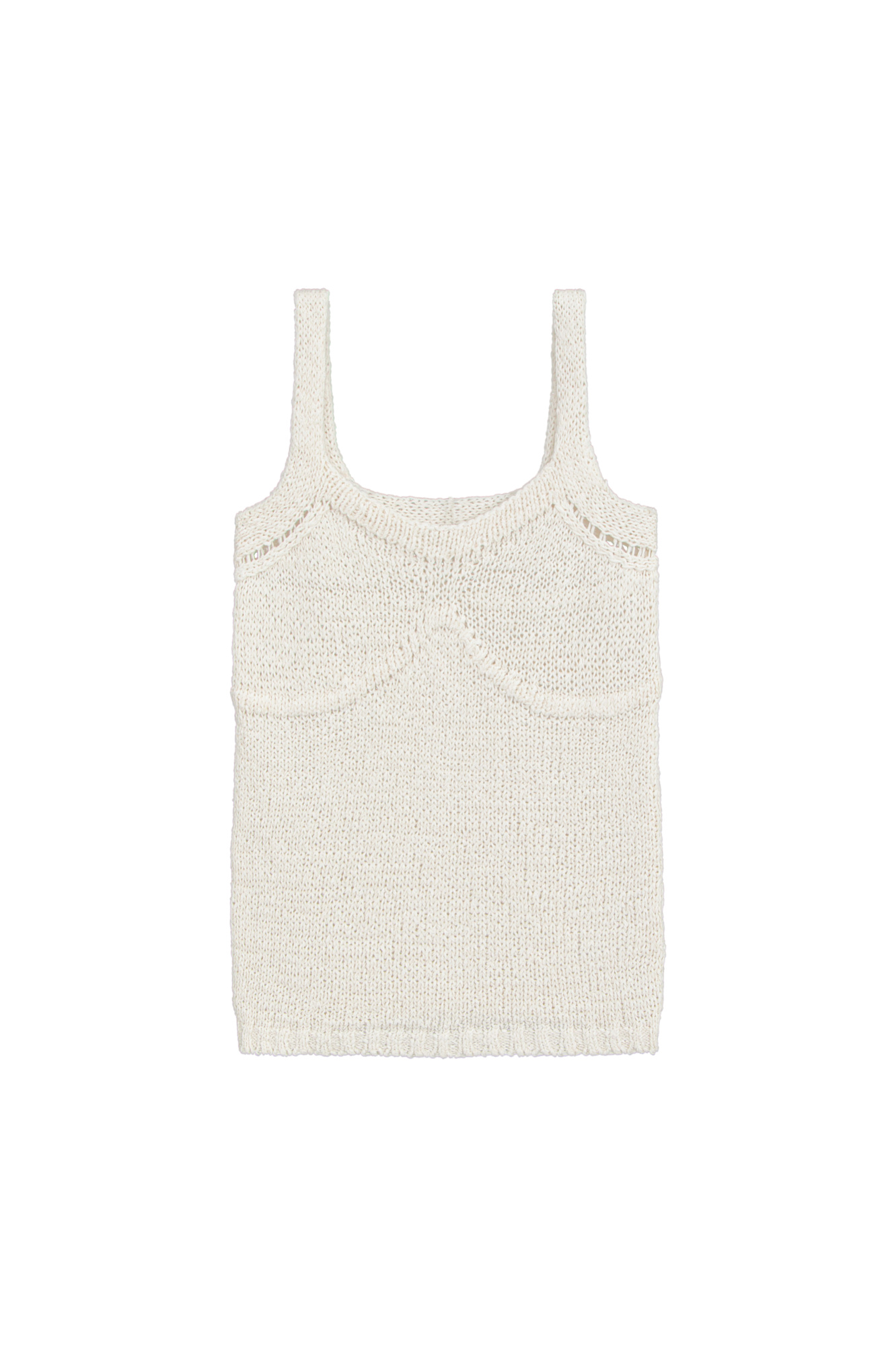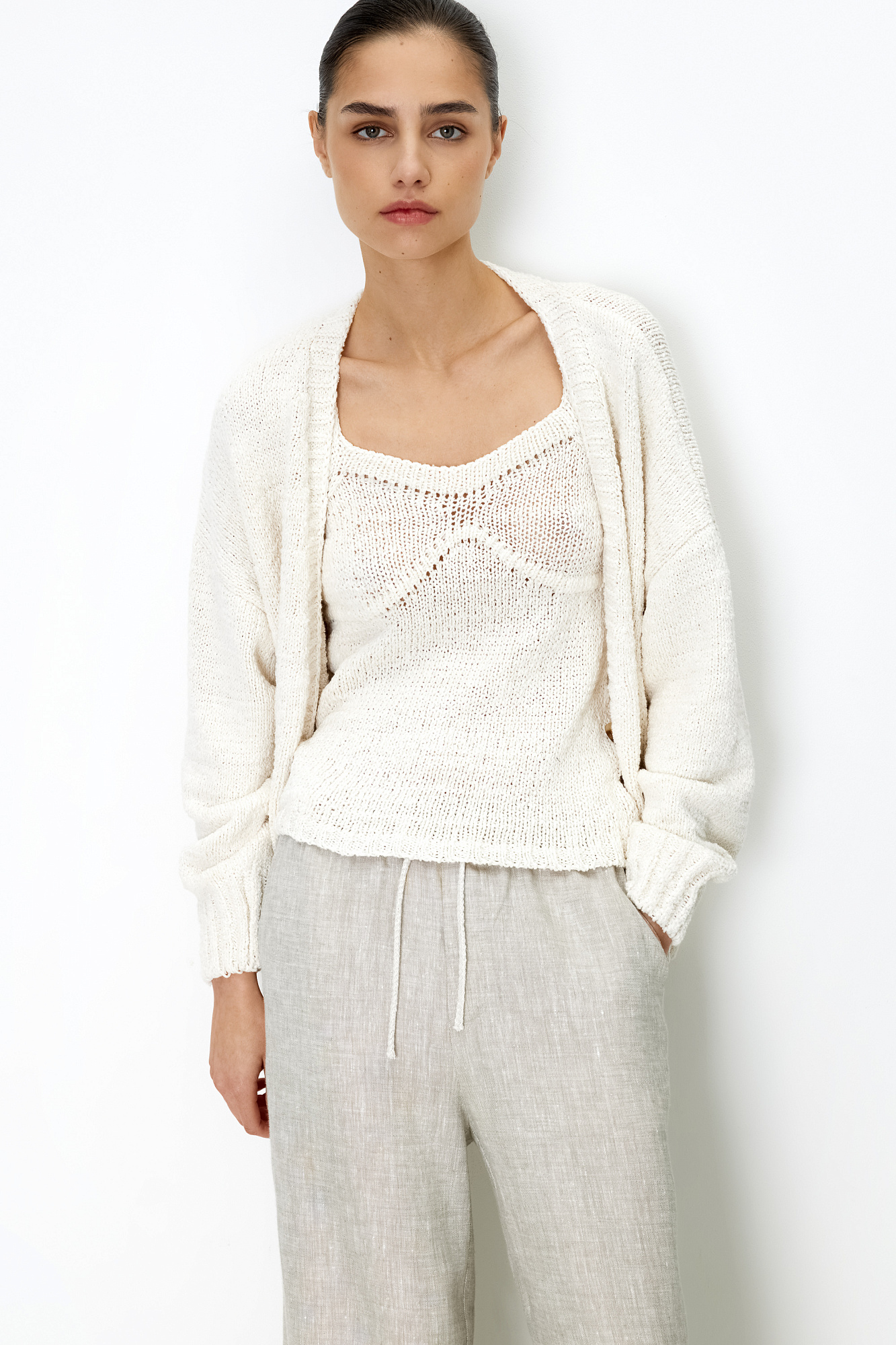 Трикотажный топ из хлопка с добавлением акрила. Модель на тонких бретелях с вывязанным лифом.