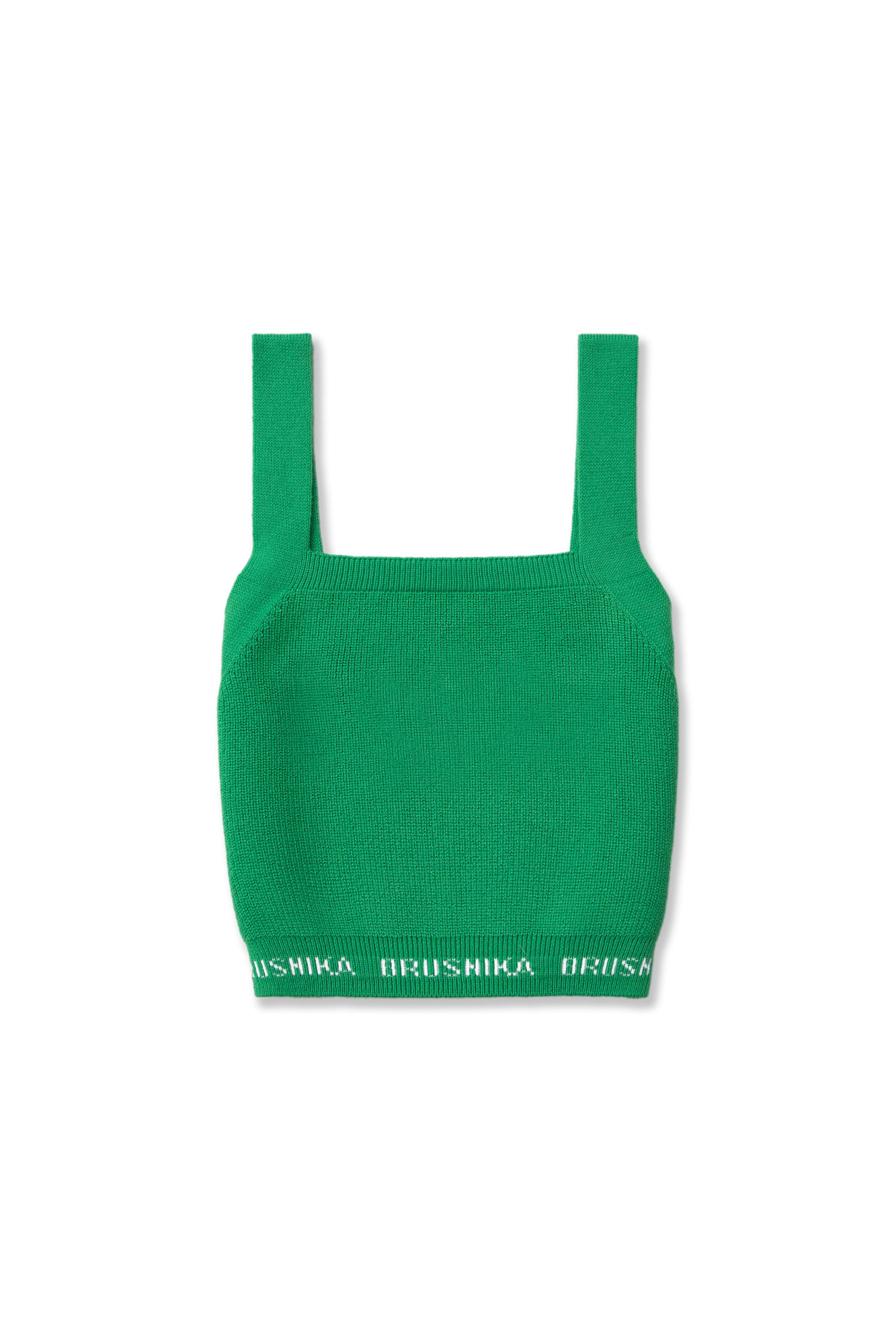 Трикотажный кроп-топ из хлопка с добавлением вискозы. Модель на широких лямках. по нижнему краю изделие декорировано контрастной вышивкой с названием бренда.