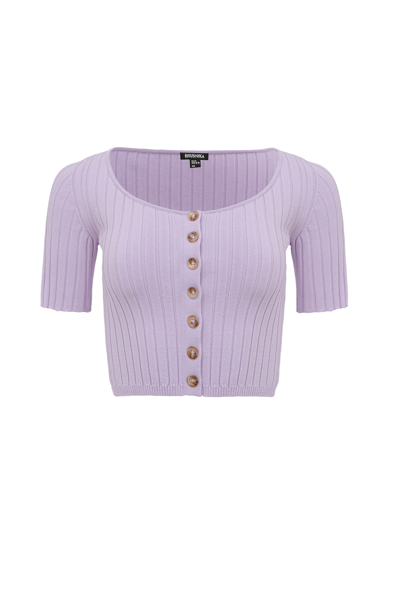 Укороченный кроп-топ на пуговицах из вискозы, выполнен из мягкой пряжи в рубчик, с коротким рукавом.