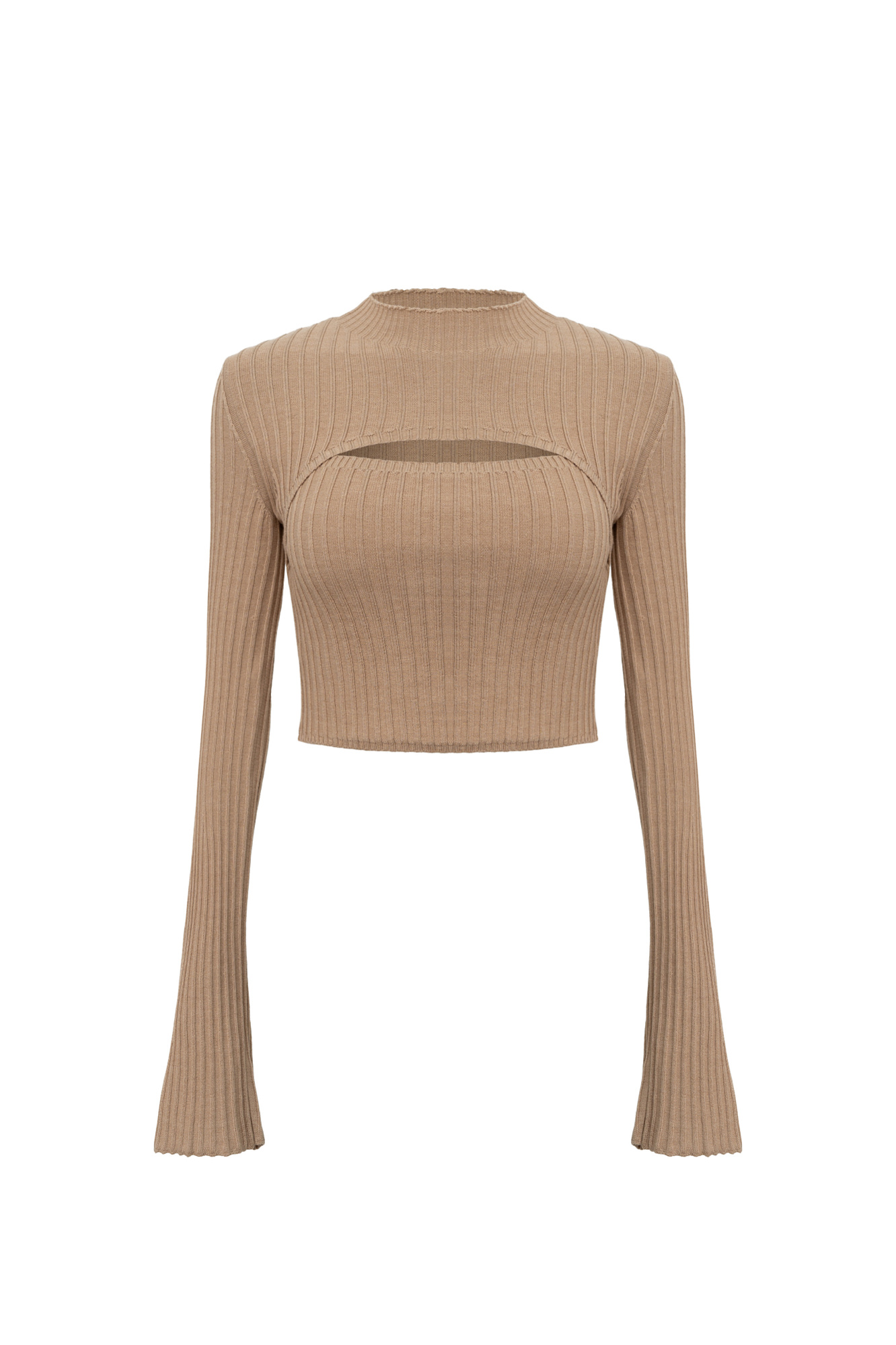 Трикотажный топ из шерсти мериноса экстрафайн. Модель по фигуре с длинными расклешенными рукавами и акцентным вырезом на груди.