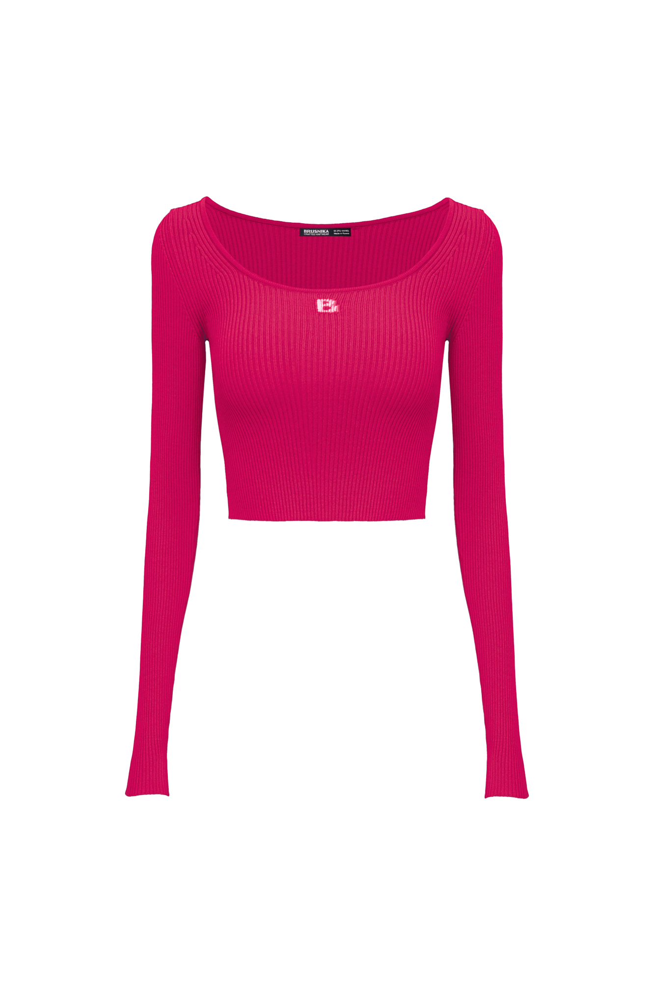 Укороченный топ из вискозы в спортивном стиле с длинными рукавами и круглым вырезом. Дополнить образ можно лосинами или юбкой.