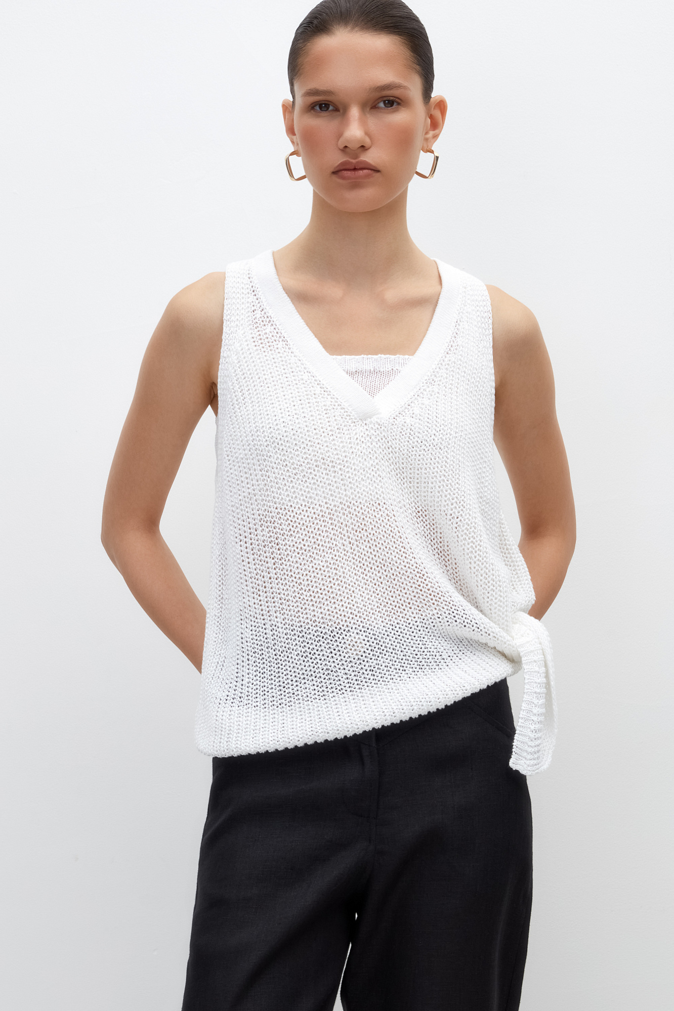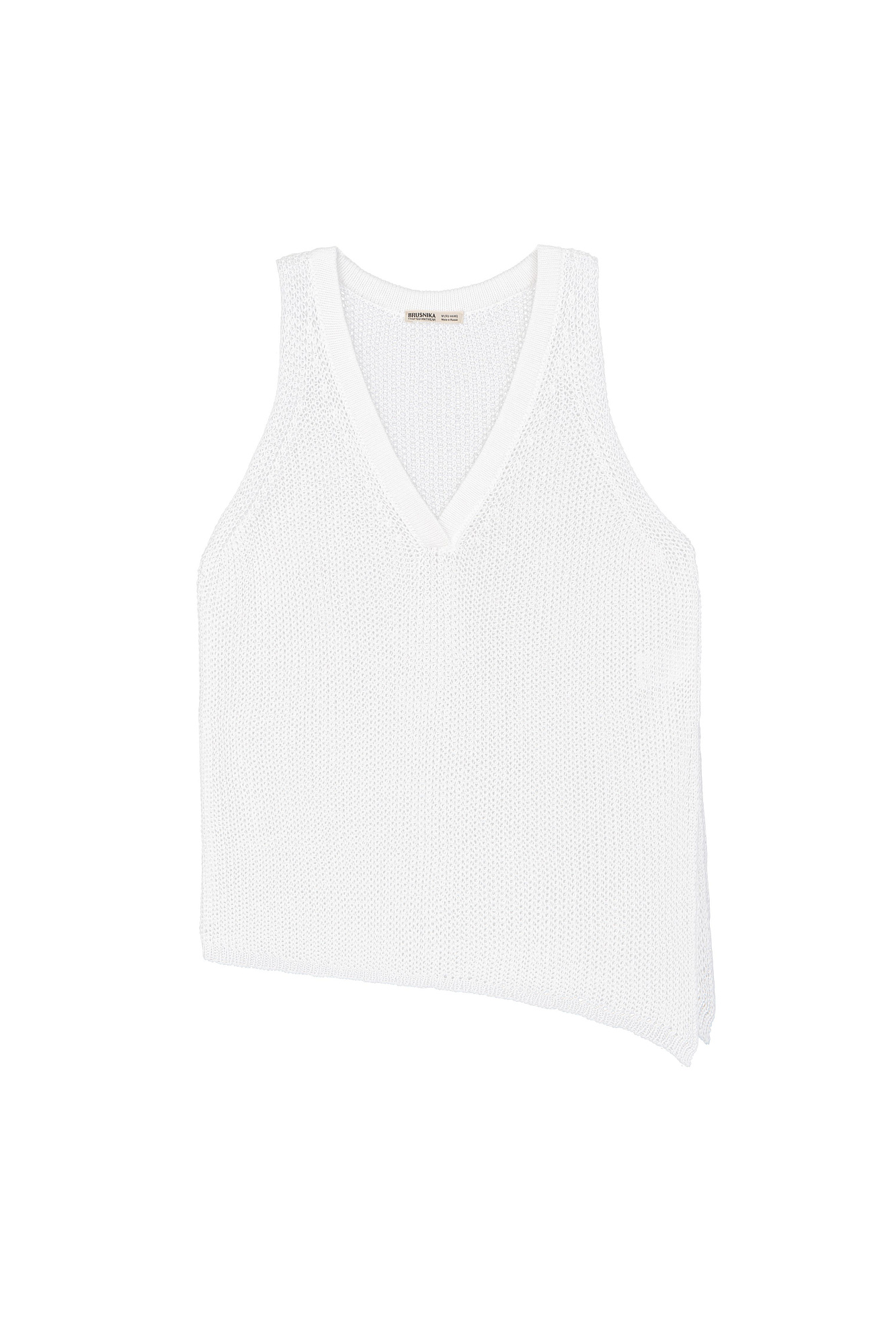 Трикотажный топ из 100% льна с V-образным вырезом. Модель асимметричного силуэта с глубокой проймой.