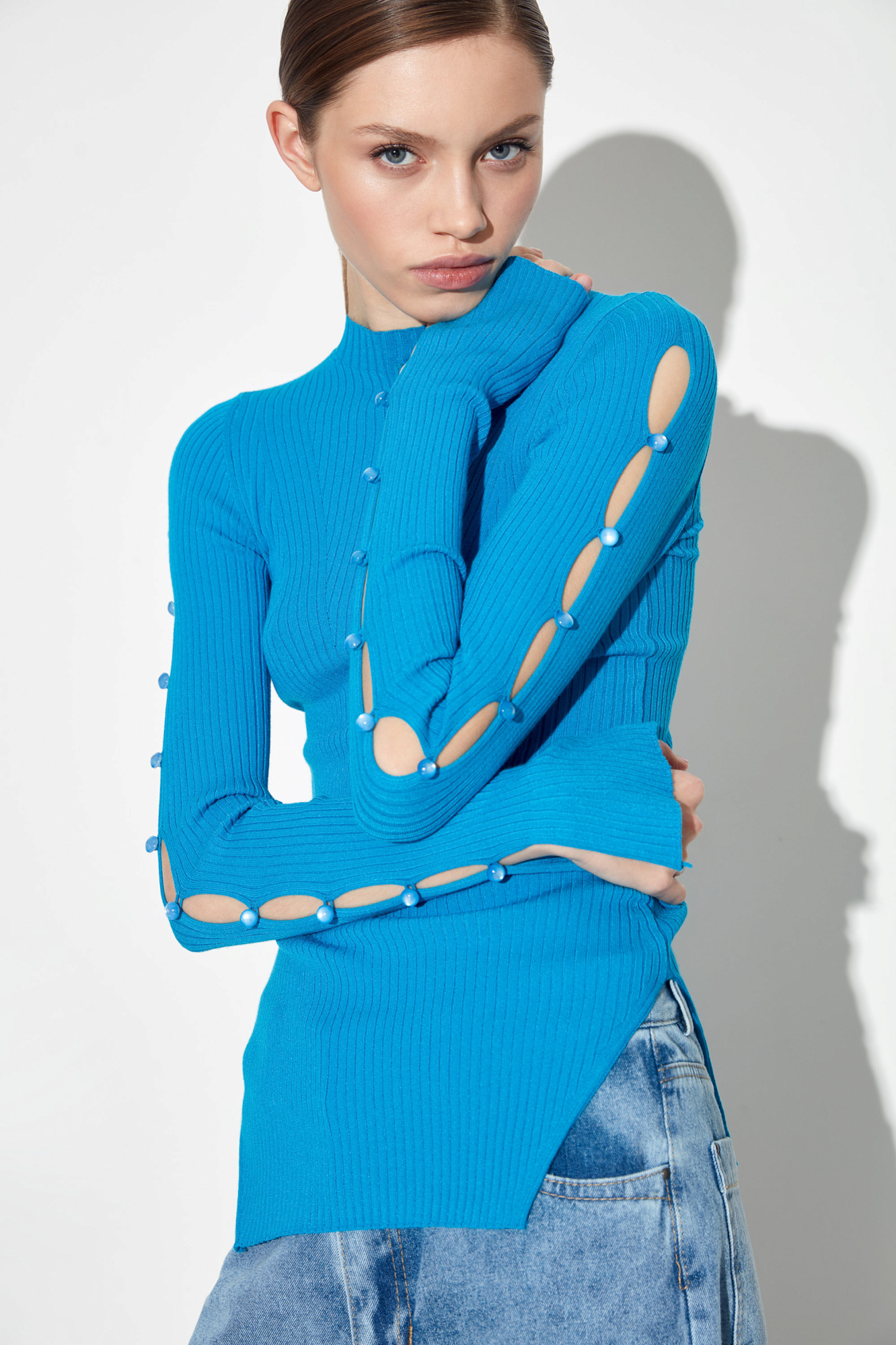 Трикотажный топ из вискозы. Модель приталенного силуэта, разрезами по бокам, с длинными рукавами на пуговицах, невысоким воротником-стойкой и декоративными сбавками на груди.