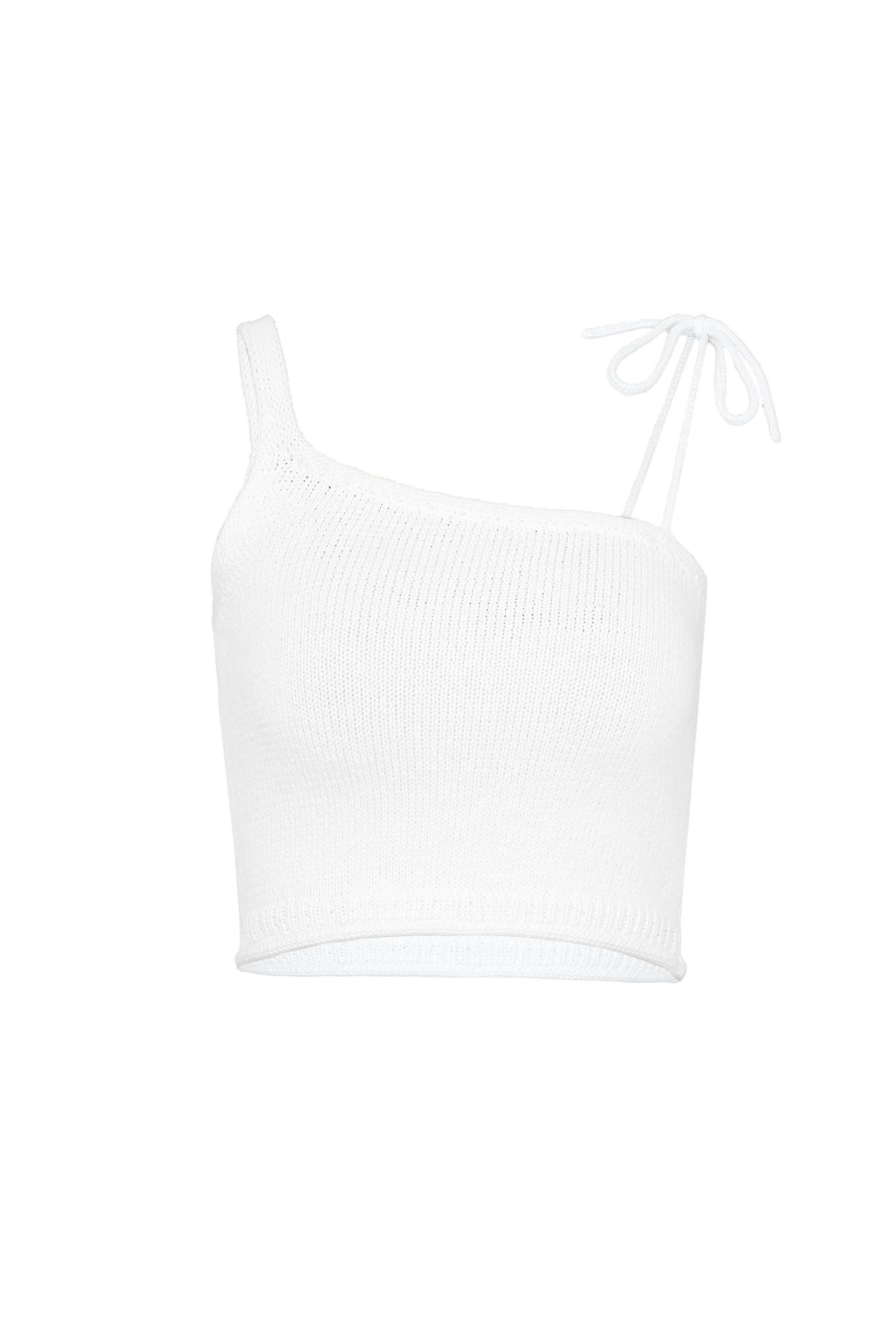 Топ на одно плечо из 100% хлопка со шнурком-завязкой и валиком по низу изделия. Дополнить образ можно юбкой с вырезом сбоку.
