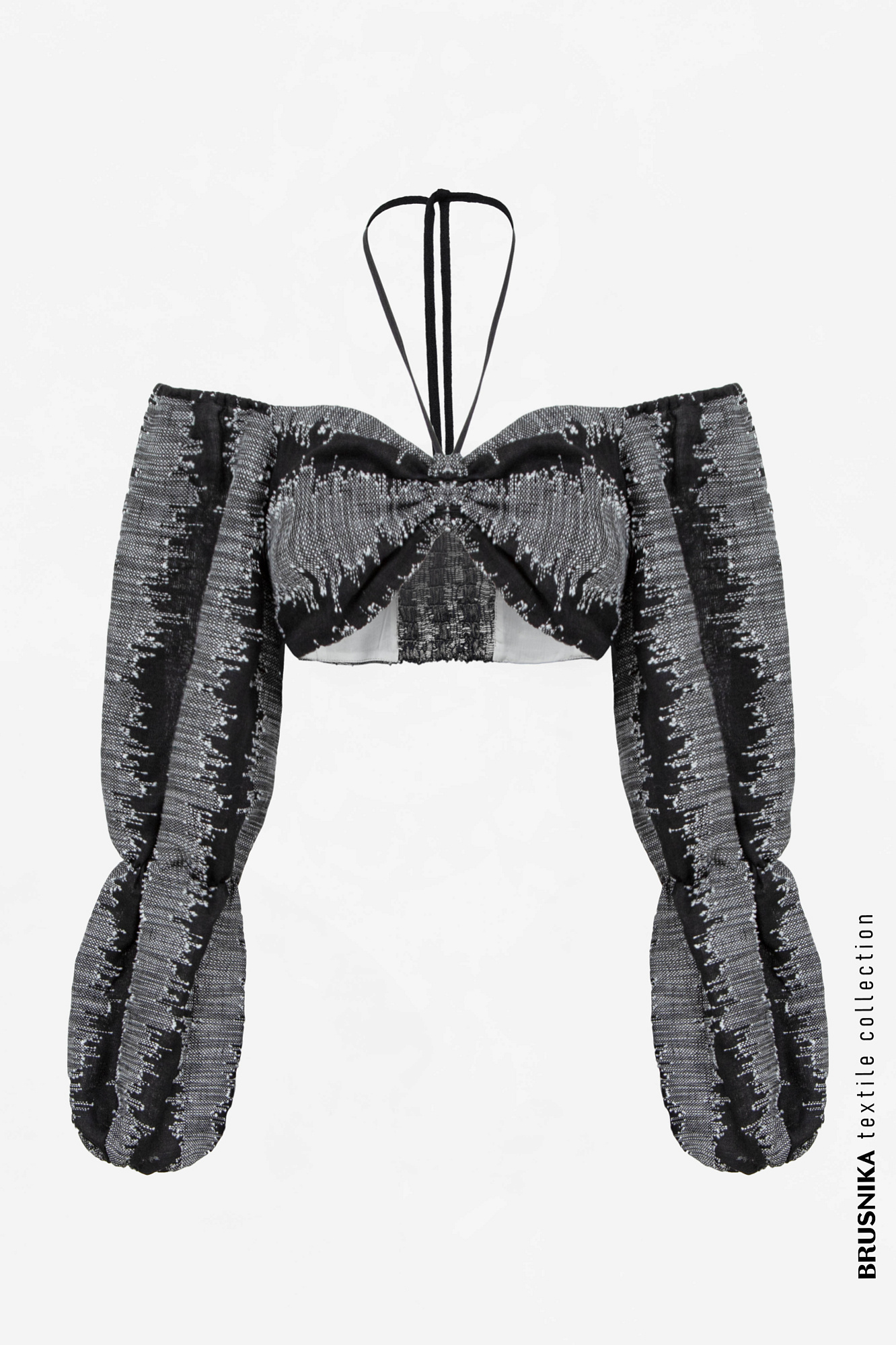 Короткий топ из 100% льна на тонкой кулиске вокруг шеи. Длинные рукава-фонарики.