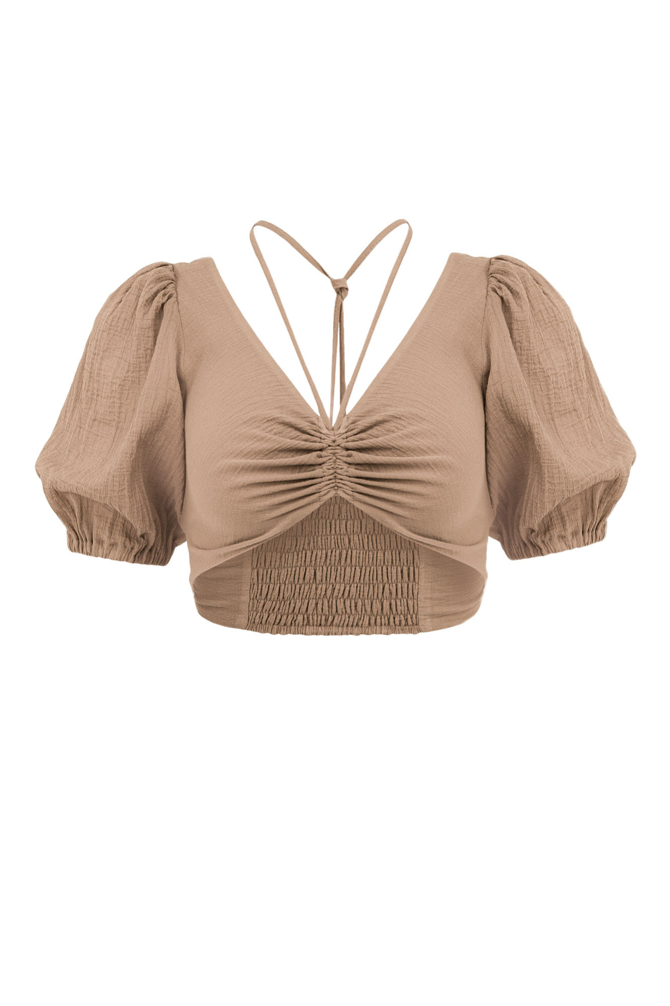 Короткий топ из 100% хлопка на тонкой кулиске вокруг шеи, рукава-фонарики.