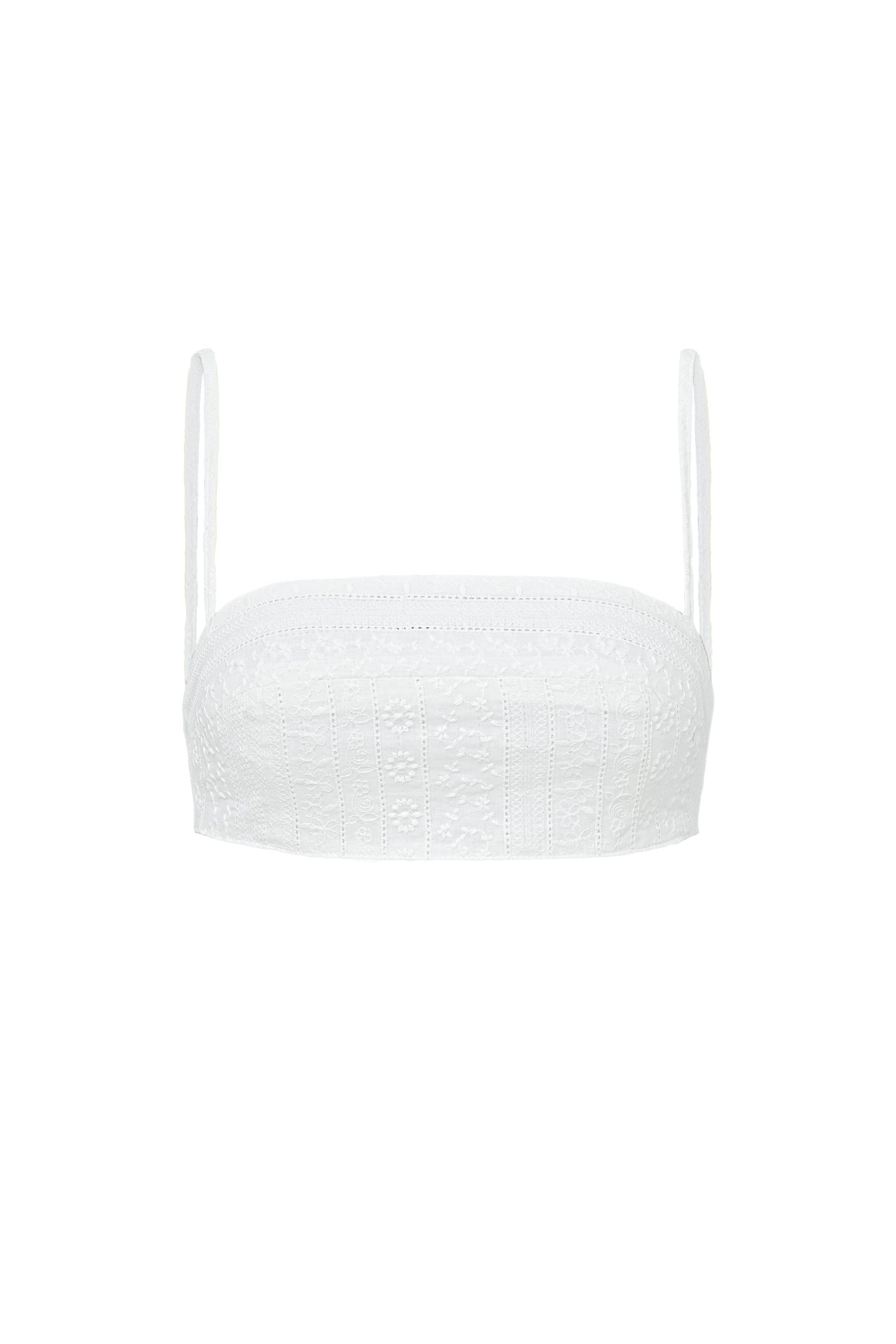Укороченный топ из 100% хлопка на тонких бретелях. Дополнить образ можно рубашкой и шортами из такой же ткани.
