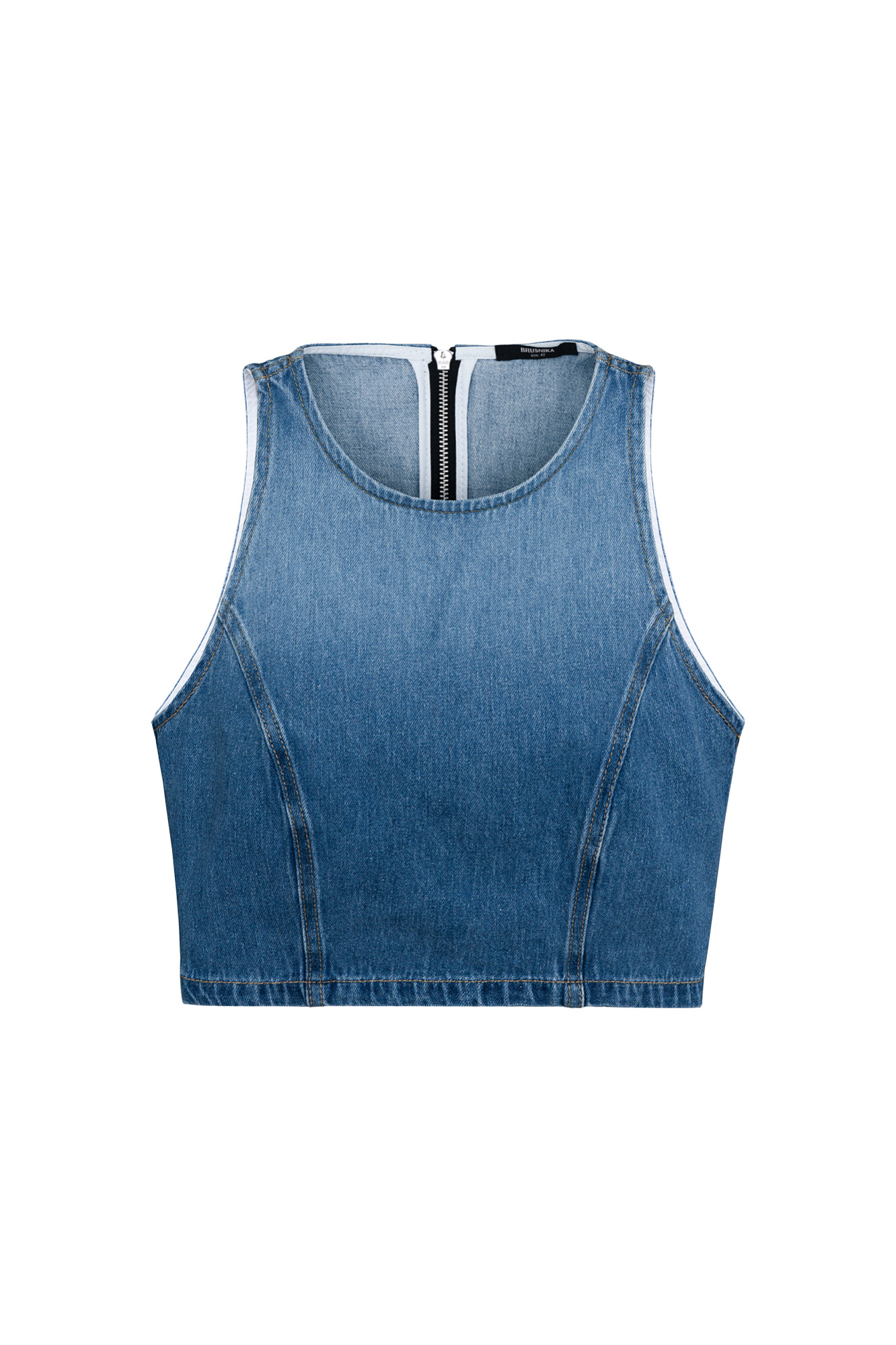 Джинсовый короткий топ  из 100% хлопка. Модель приталенного силуэта, без рукавов, глубокой проймой и застежкой на молнию сзади. Цвет полотна изделия сменяется с темного на светлый, создавая градиент. Дополнить образ можно юбкой.