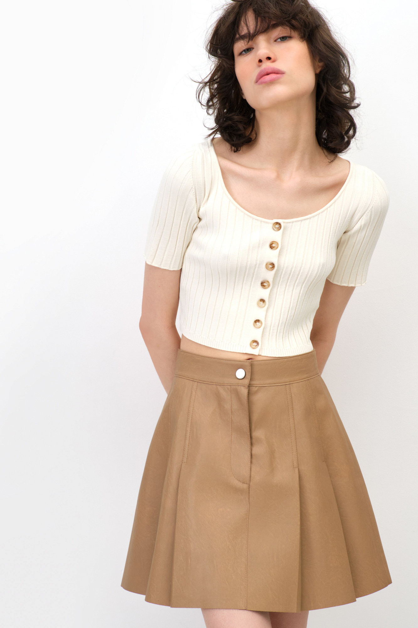 Укороченный кроп-топ на пуговицах из вискозы, выполнен из мягкой пряжи в рубчик, с коротким рукавом.