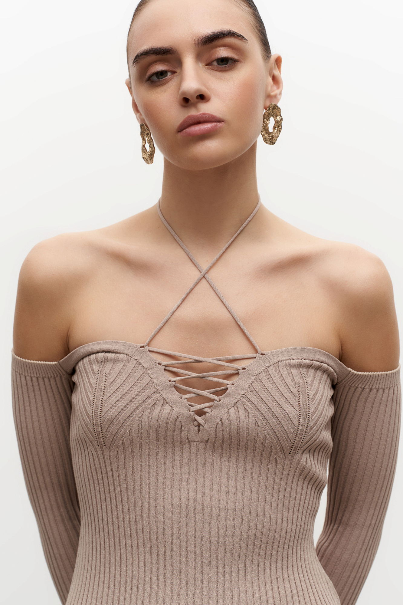Трикотажные топ из вискозы. Модель с длинными рукавами, разрезами по бокам и глубоким декольте со шнуровкой.