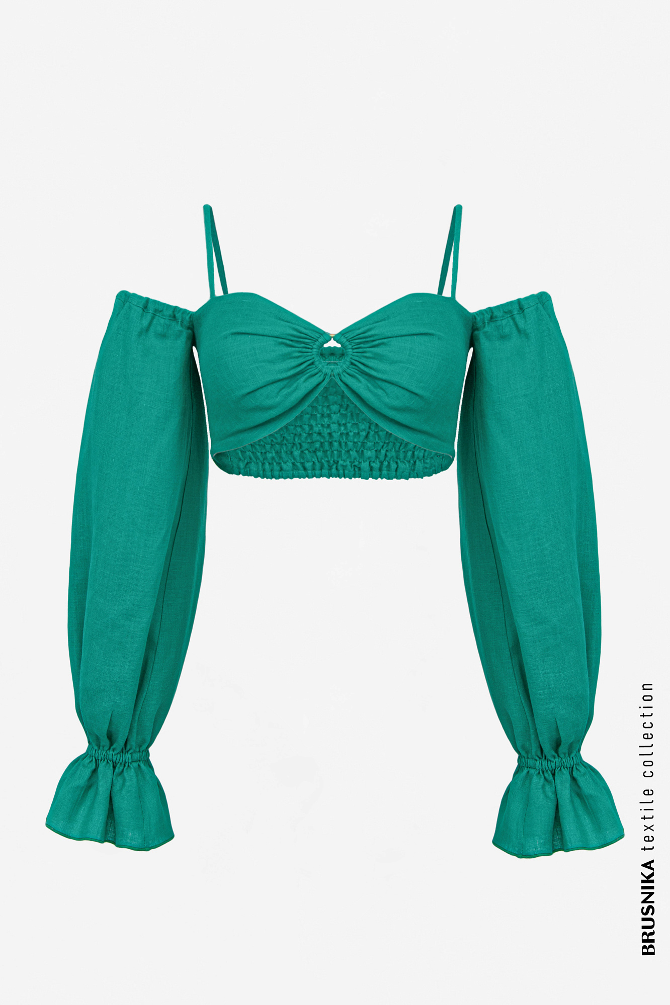 Короткий топ из 100% льна на тонких бретелях. Длинные рукава-фонарики.