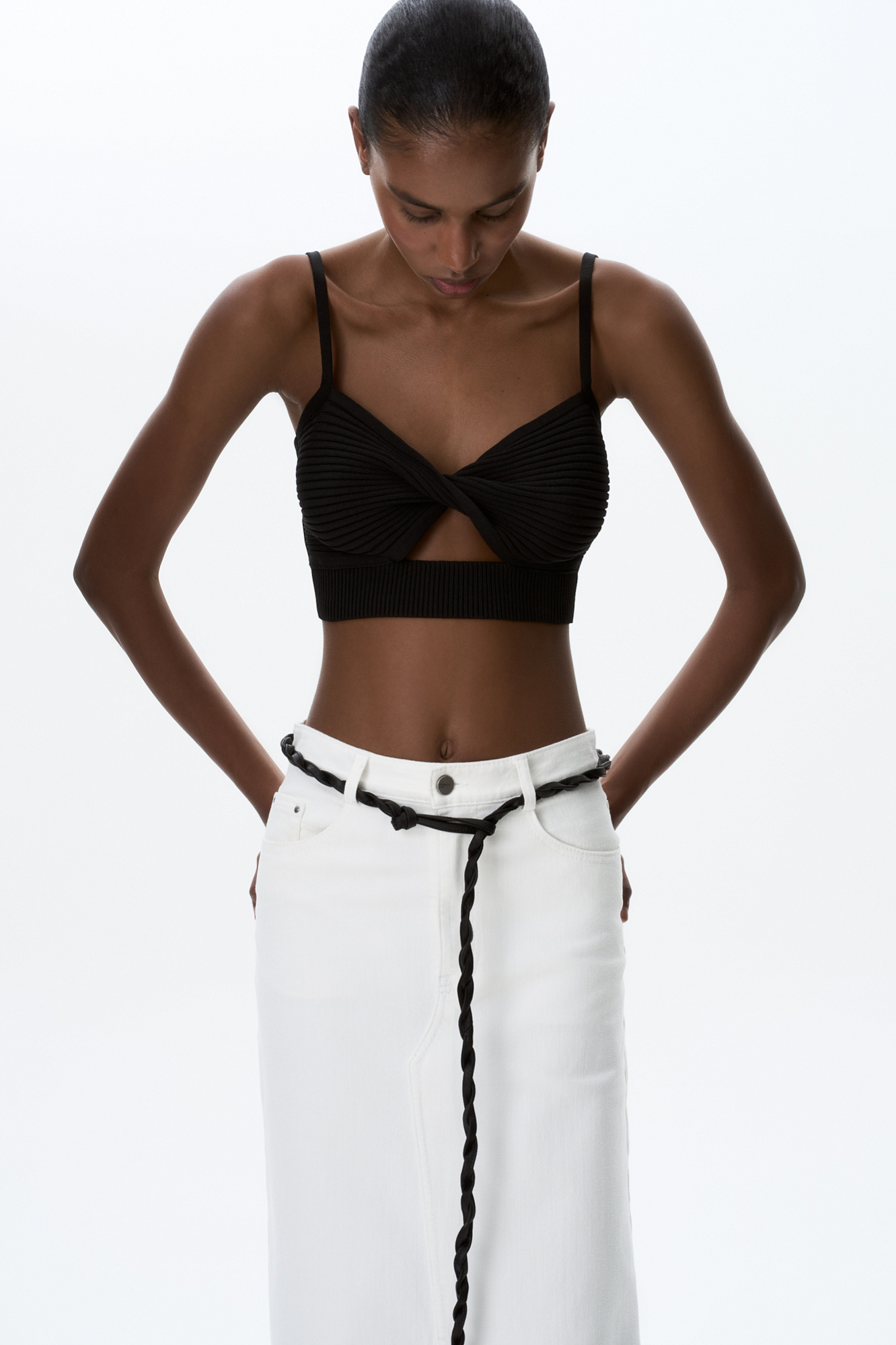 Трикотажный топ с перекрутом спереди на тонких бретелях. По низу топа широкая резинка для плотной фиксации на теле.