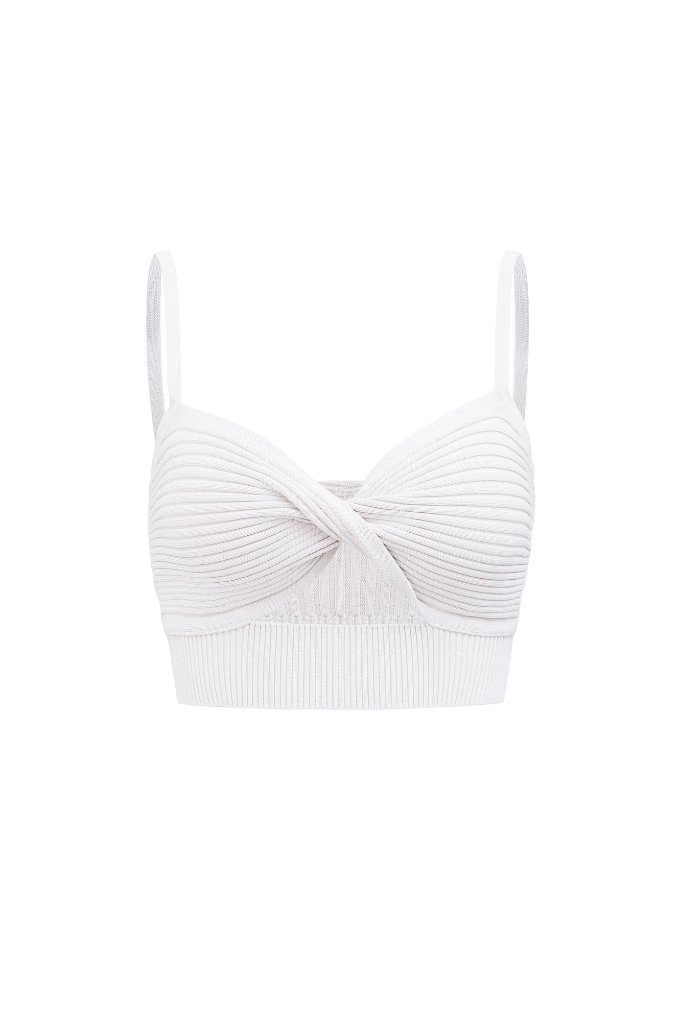 Трикотажный топ с перекрутом спереди на тонких бретелях. По низу топа широкая резинка для плотной фиксации на теле.