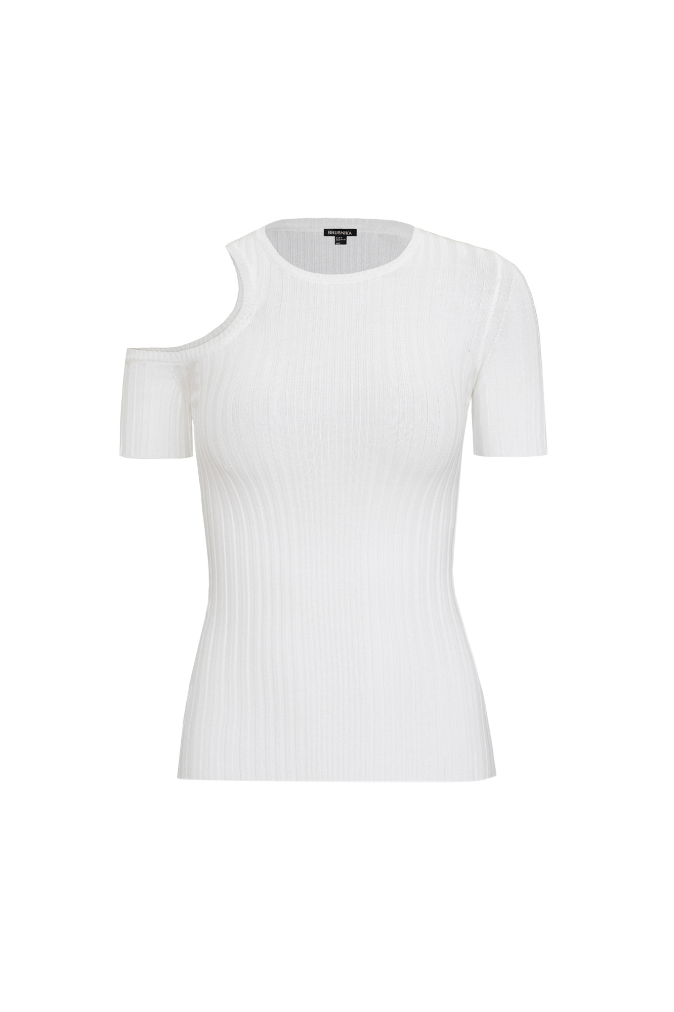 Трикотажный топ из вискозы в широкий рубчик с вырезом на плече.