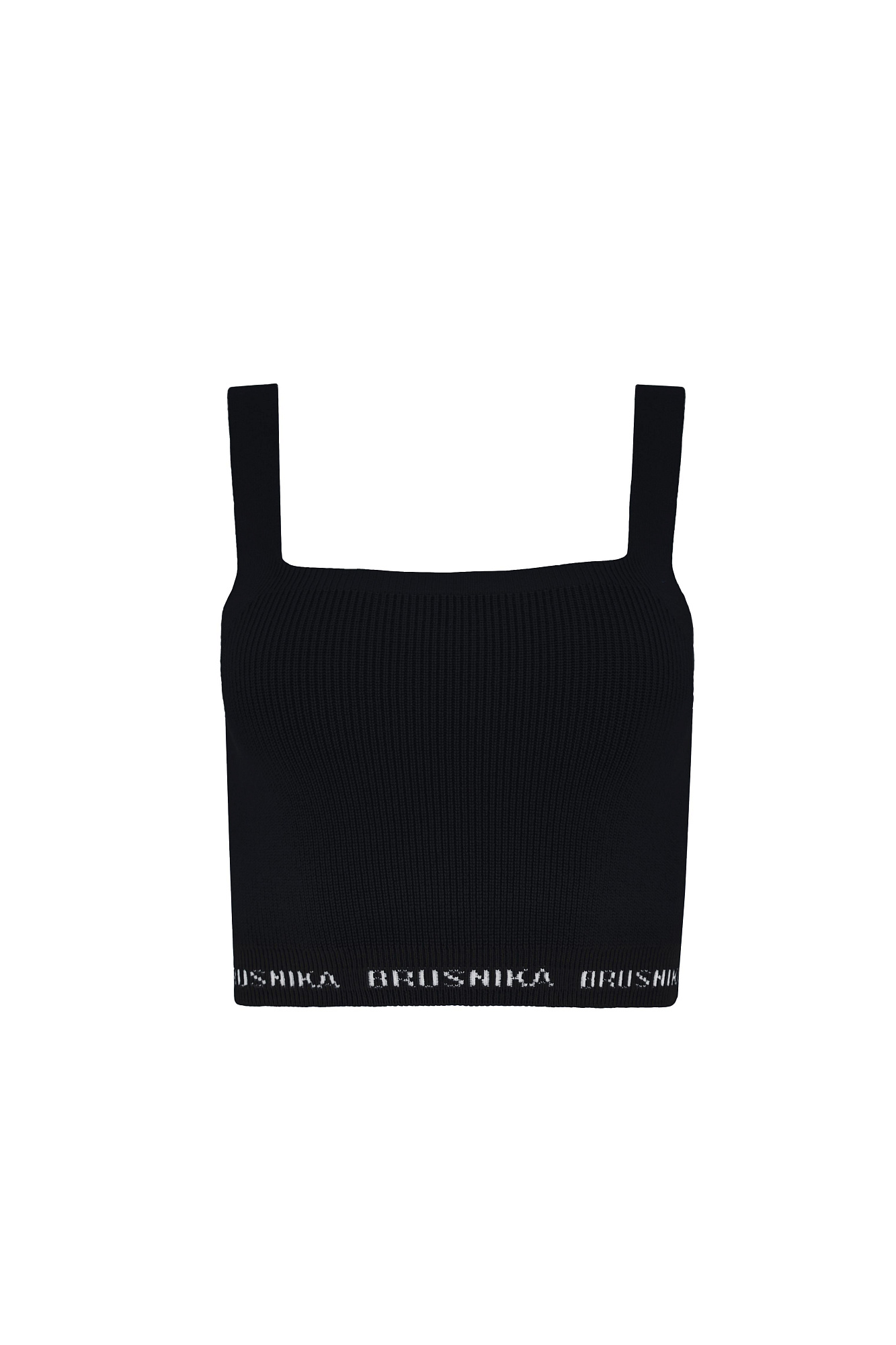 Трикотажный кроп-топ из хлопка с добавлением вискозы. Модель на широких лямках. по нижнему краю изделие декорировано контрастной вышивкой с названием бренда.