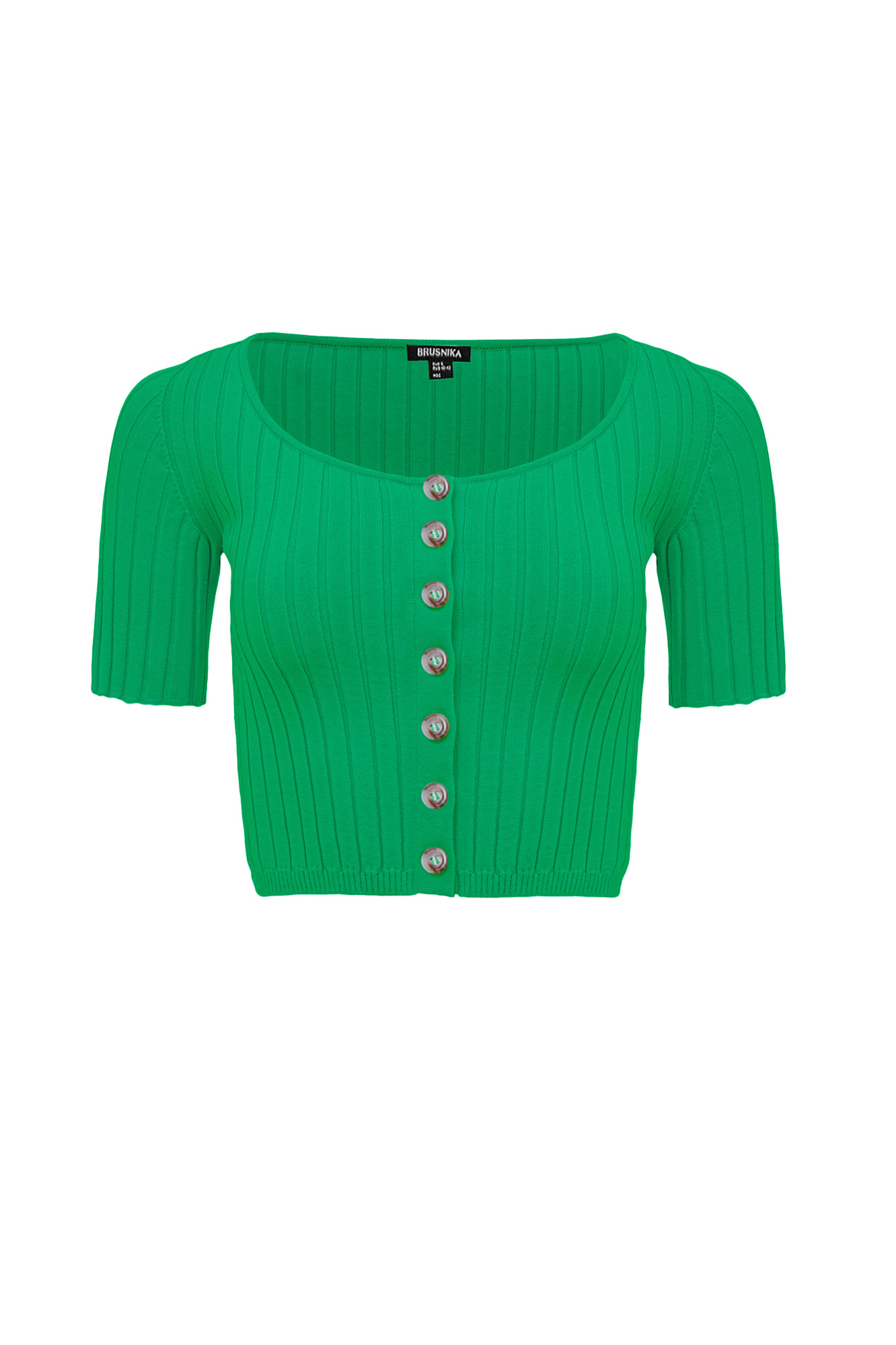 Укороченный кроп-топ на пуговицах из вискозы, выполнен из мягкой пряжи в рубчик, с коротким рукавом.