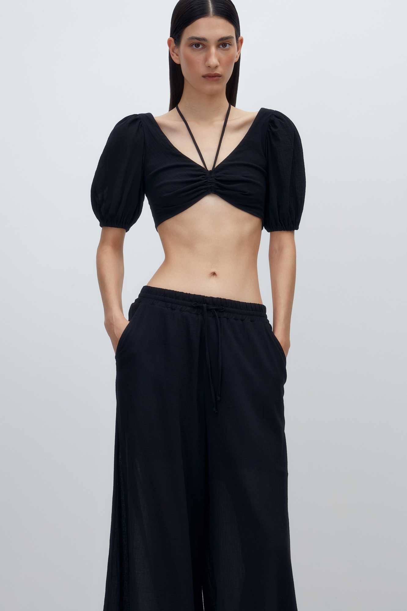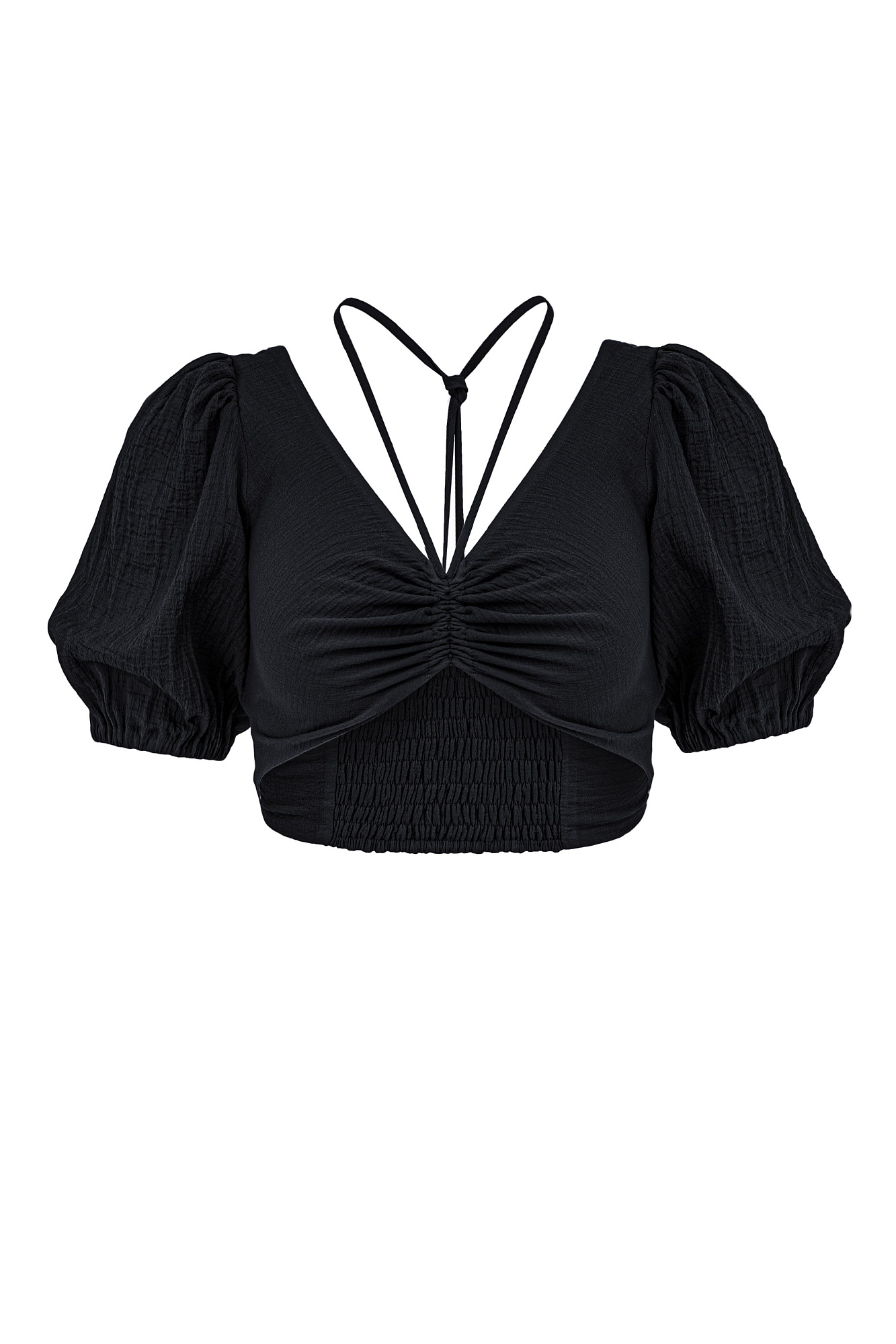 Короткий топ из 100% хлопка на тонкой кулиске вокруг шеи.