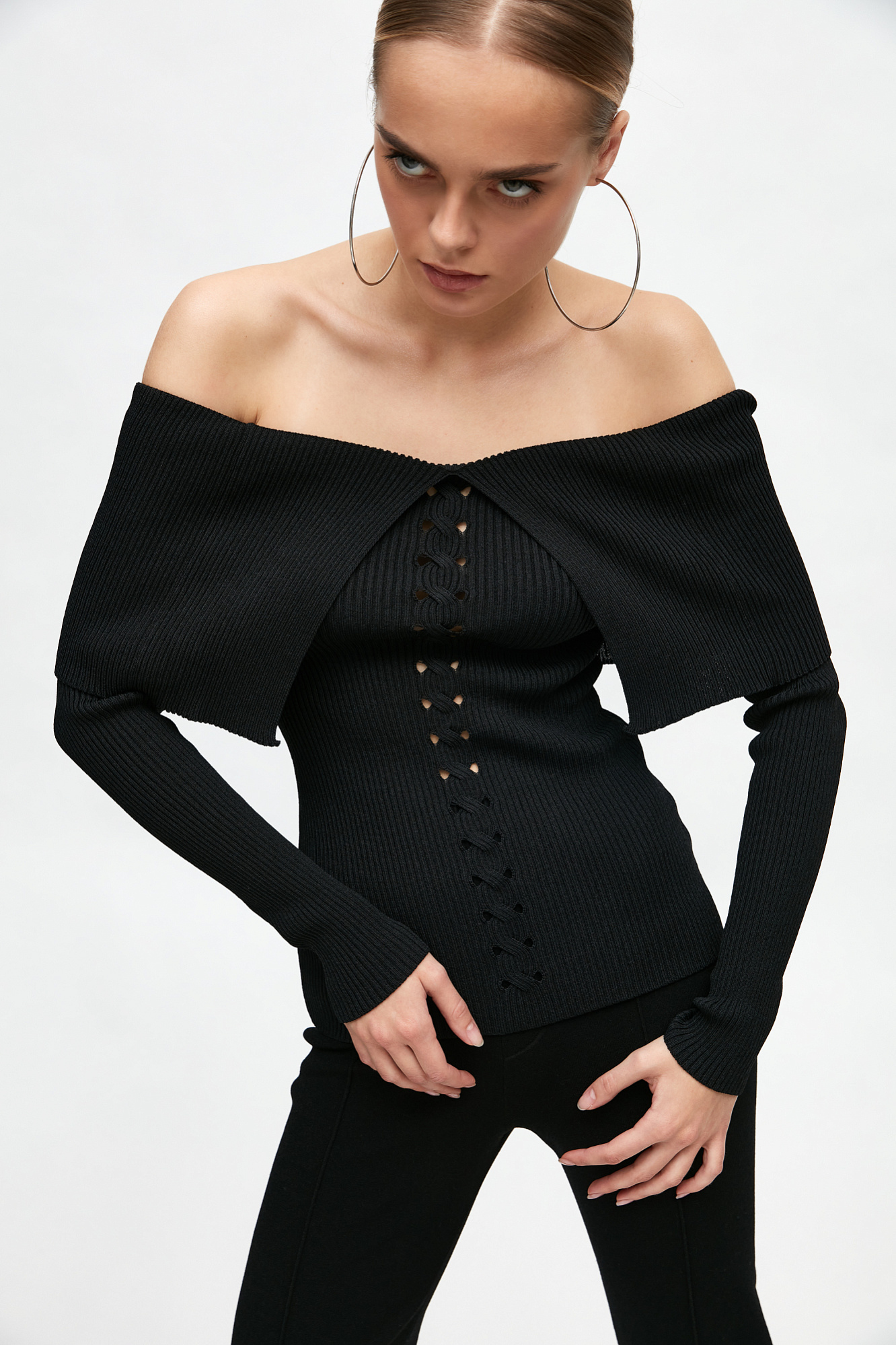 Приталенный топ из вискозы с длинным рукавом и открытыми плечами. Модель декорирована вывязанным орнаментом в виде косы и широкой отлетной деталью.