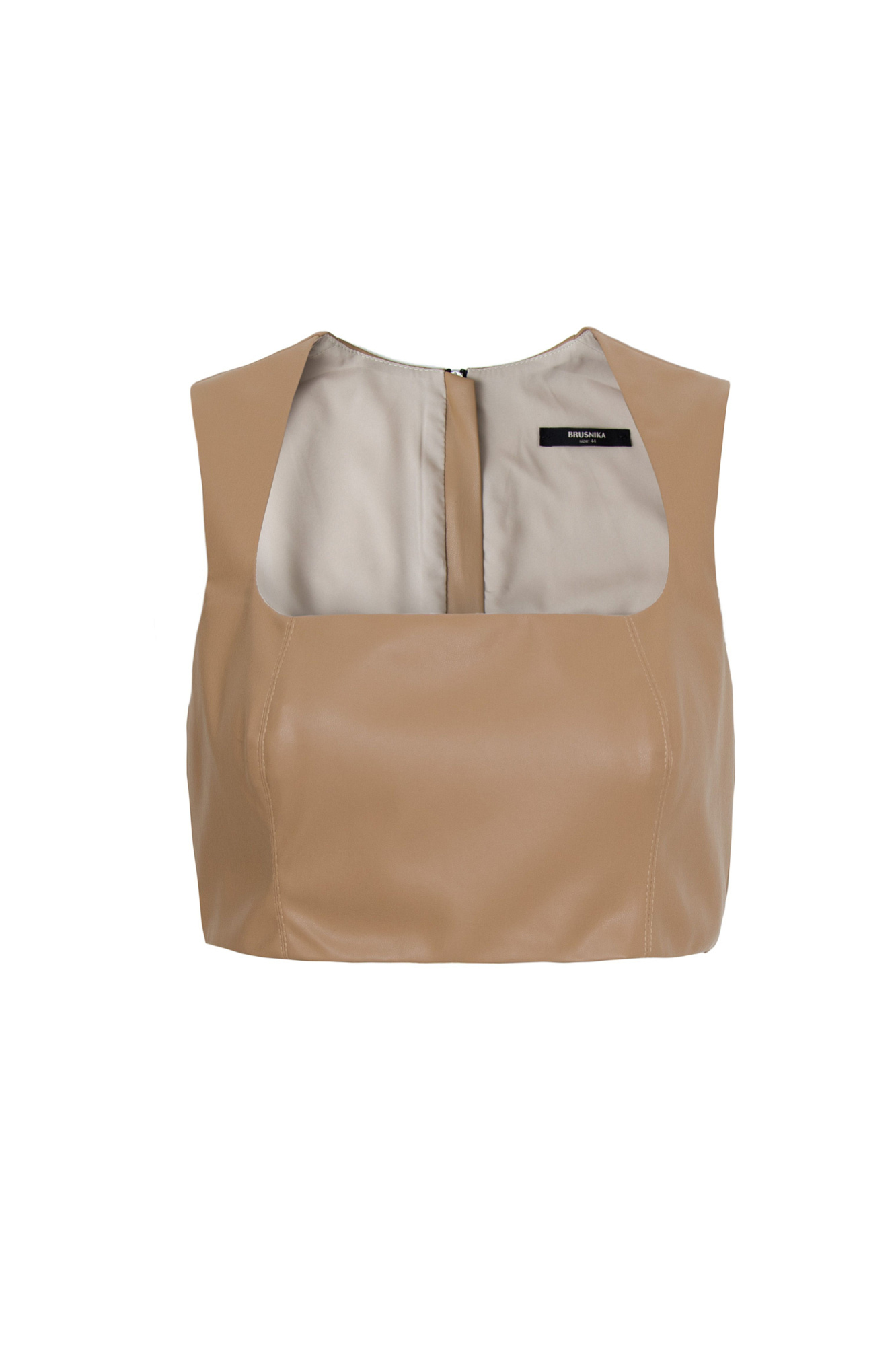 Топ из экокожи с квадратным вырезом и застежкой на молнии сзади. Дополнить образ можно плиссированной юбкой.