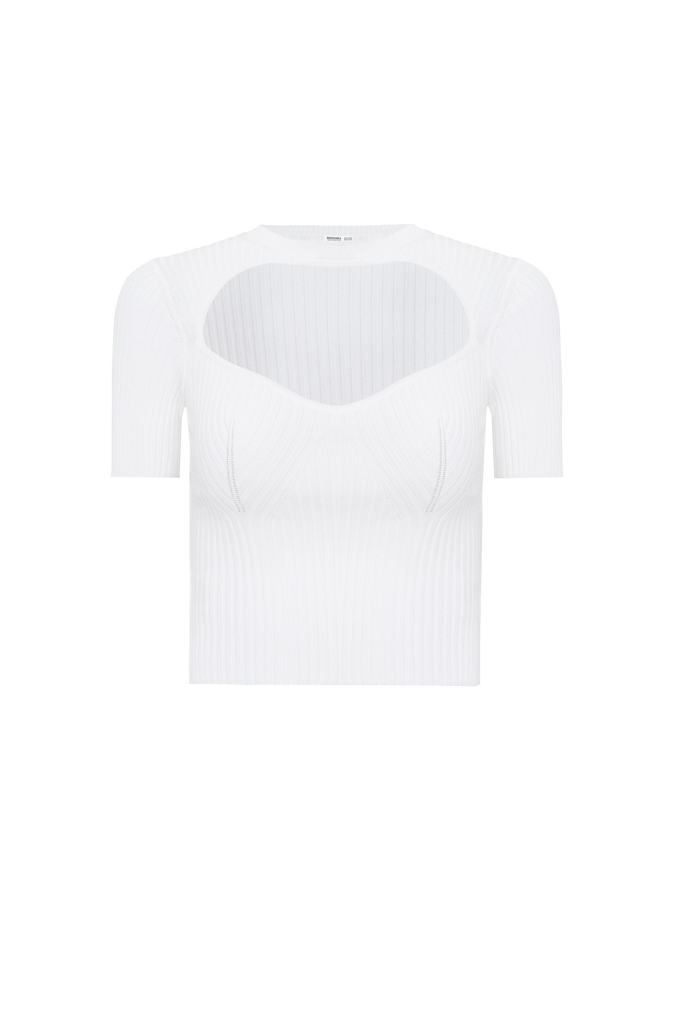Трикотажный топ в рубчик с коротким рукавом и вырезом на груди.