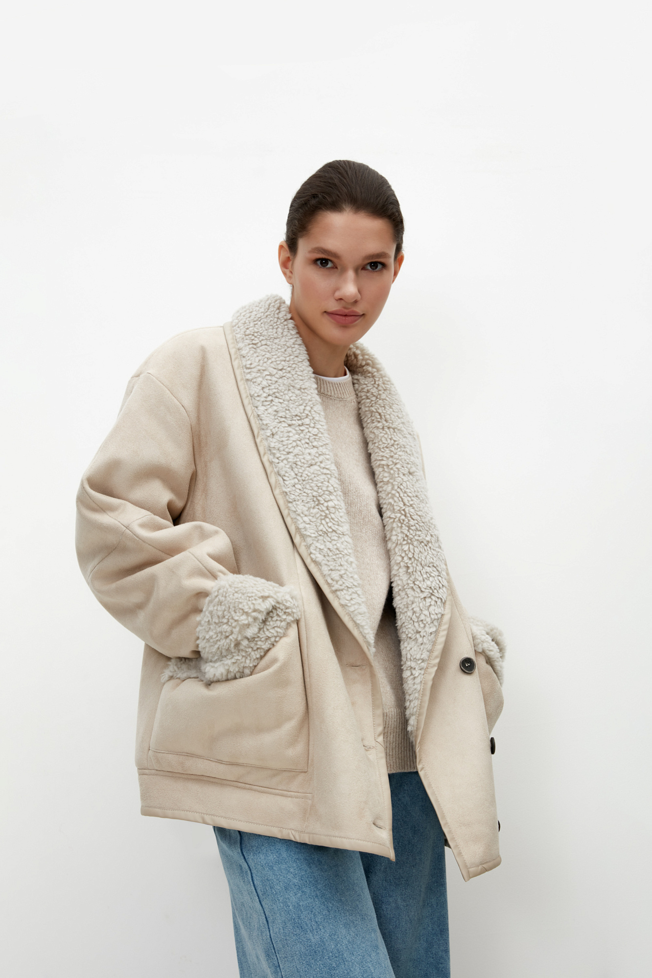 Пальто дубленка из эко-меха с воротником шалька и накладными карманами.