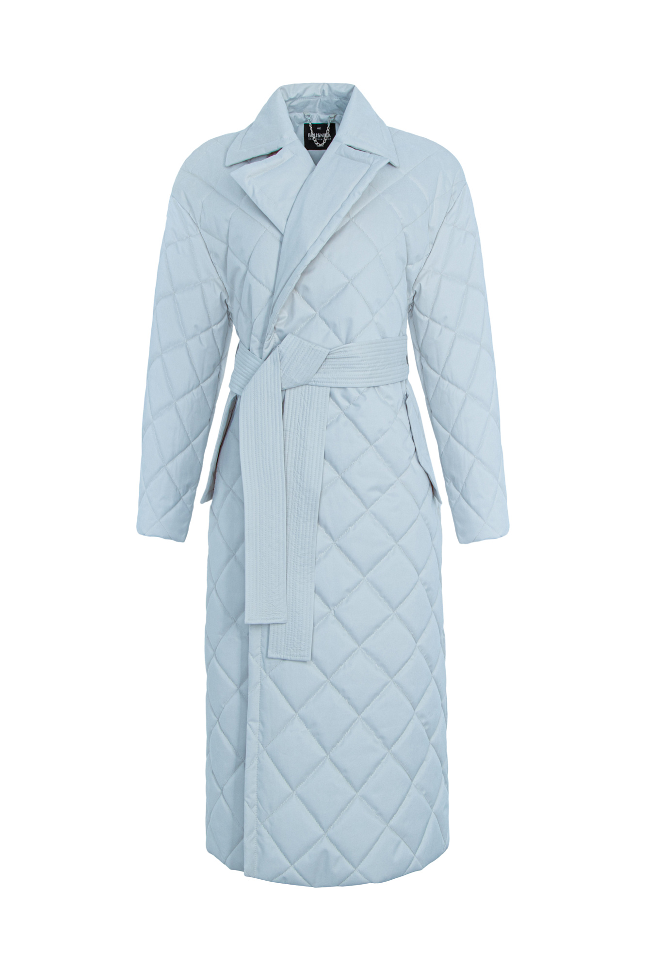Утепленное, стеганое пальто-халат из текстильного материала, дополнено поясом в тон, воротник с лацканами, два боковых кармана, без застежки.