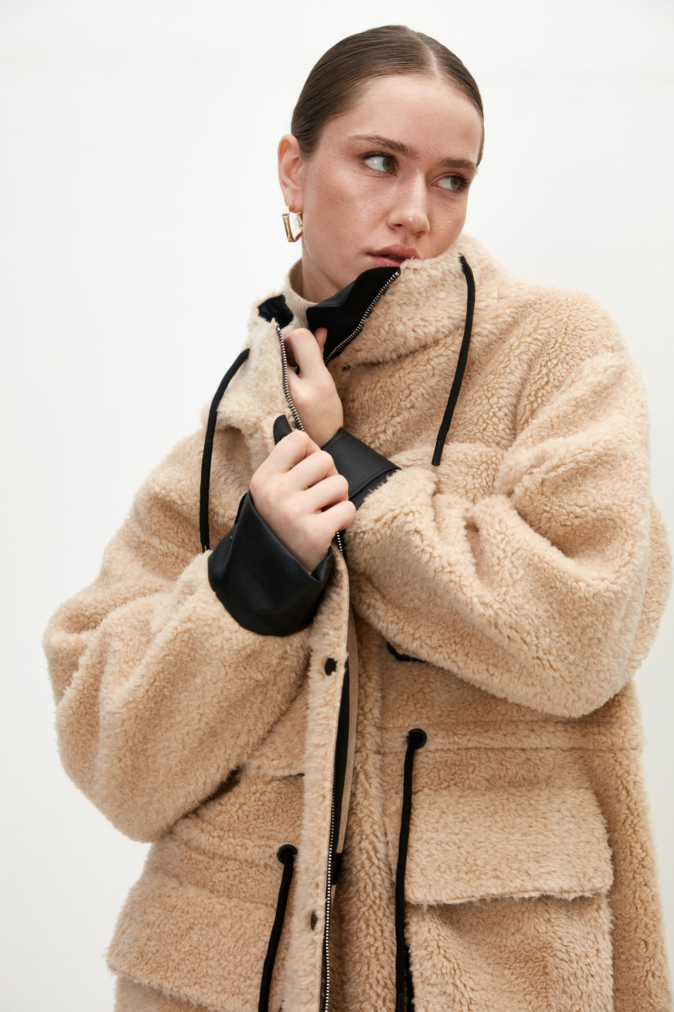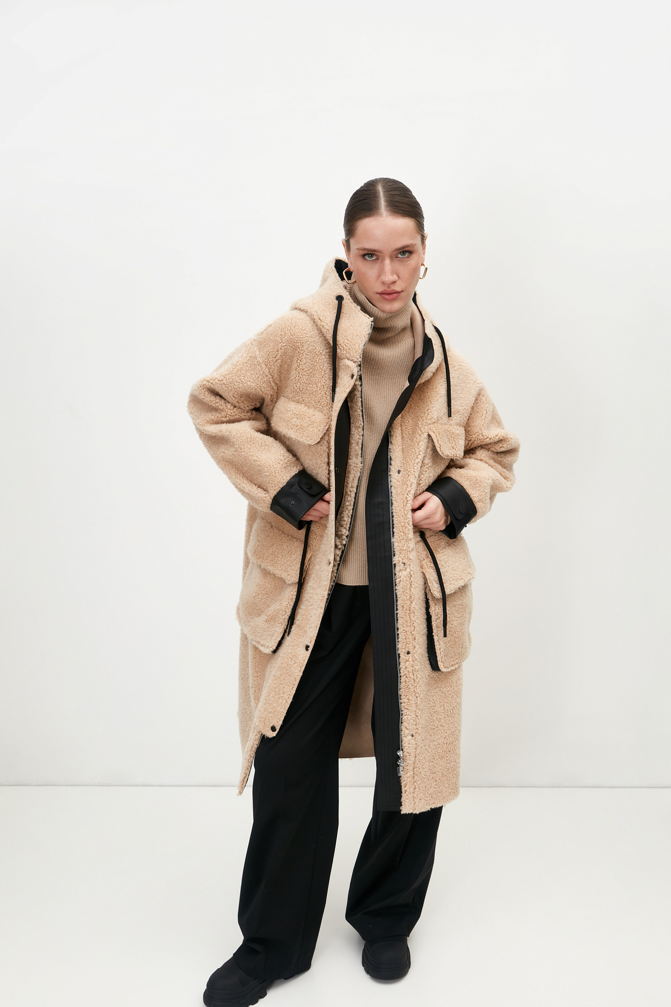 Меховое пальто из натуральной шерсти с большими накладными карманами. Застежка на молнии и кнопках. Вставки выполнены из эко-кожи.