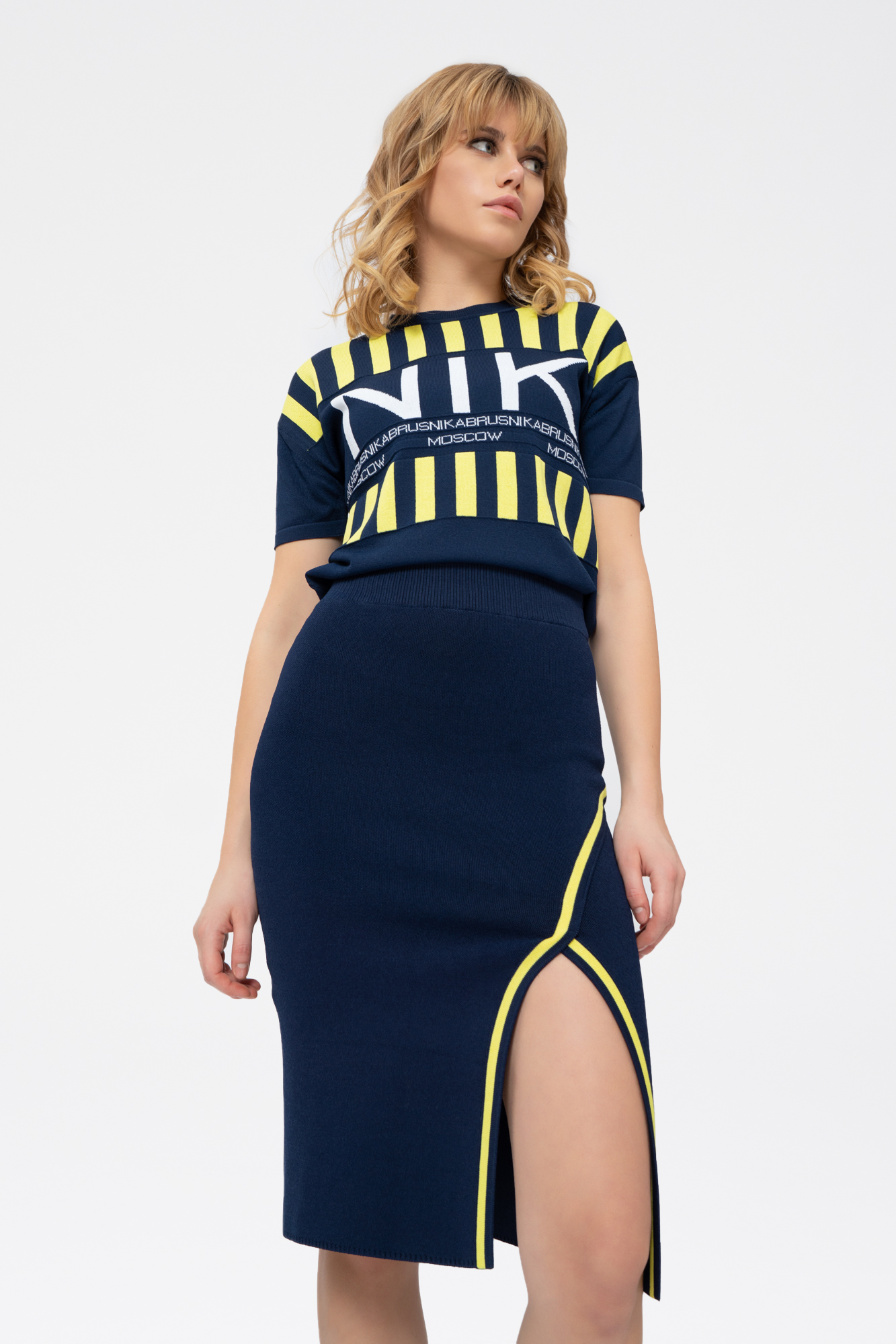 Вязаная юбка. Длина: до колена. С разрезом спереди и контрастными вывязаными лампасами. Фиксируется на талии.