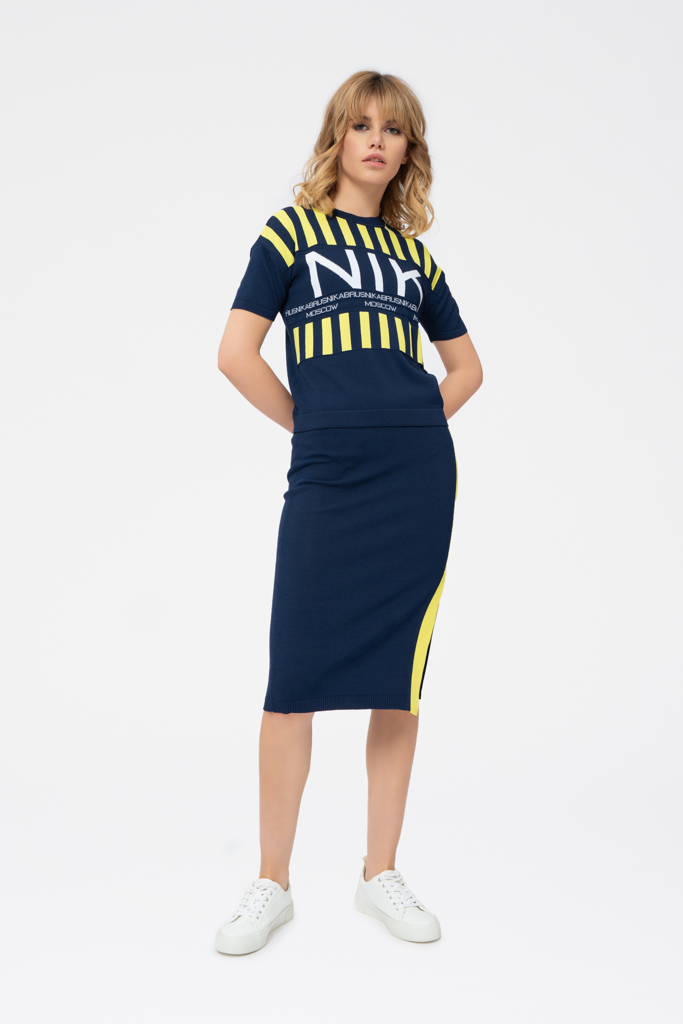 Юбка - миди приталенной формы, с декортивным разрезом и контрастным лампасом сбоку.