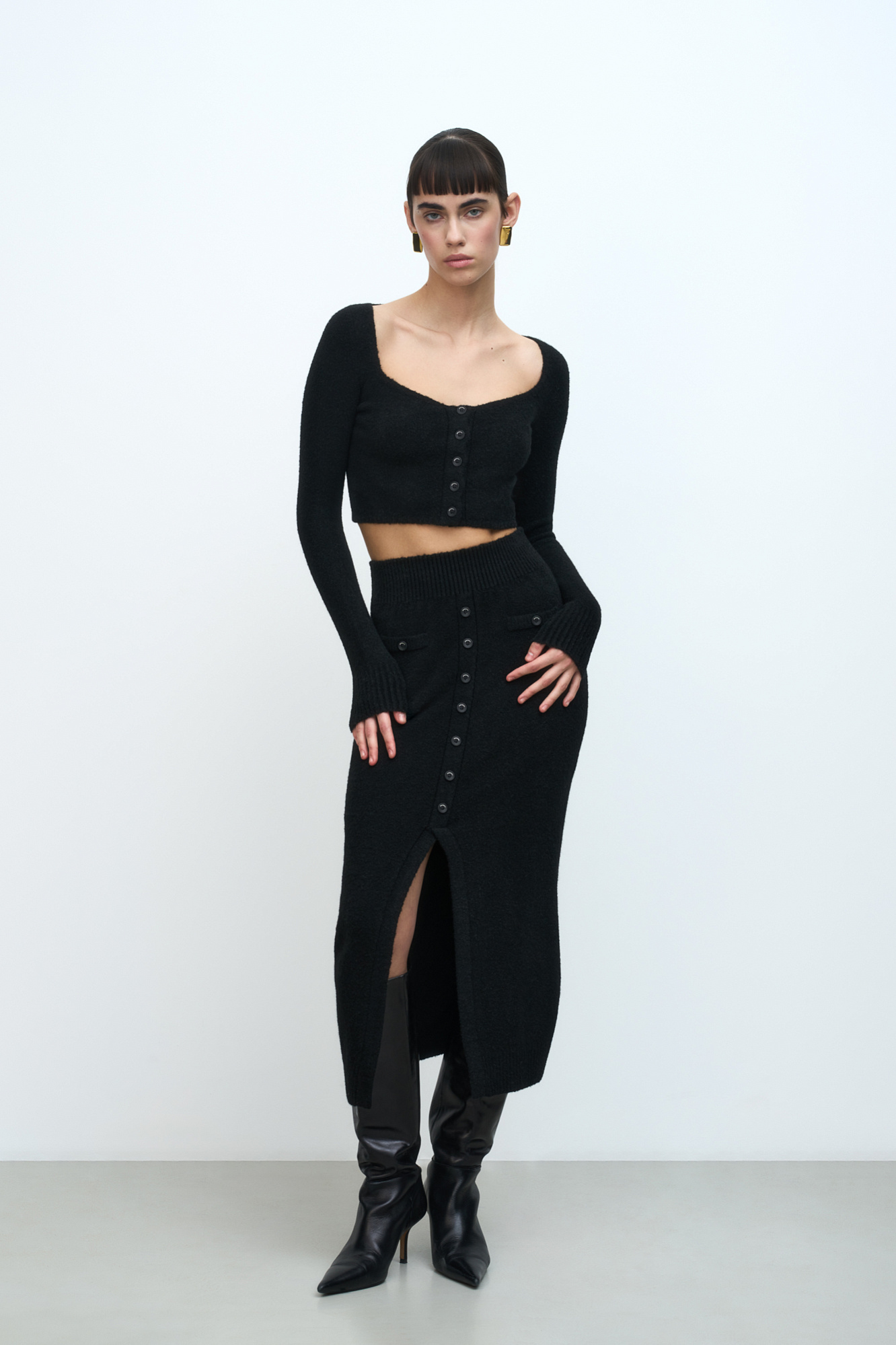 Трикотажная юбка из буклированной пряжи. Модель прямого силуэта с разрезом, декорированным пуговицами. Края изделия выполнены в рубчик. Широкий эластичный пояс.