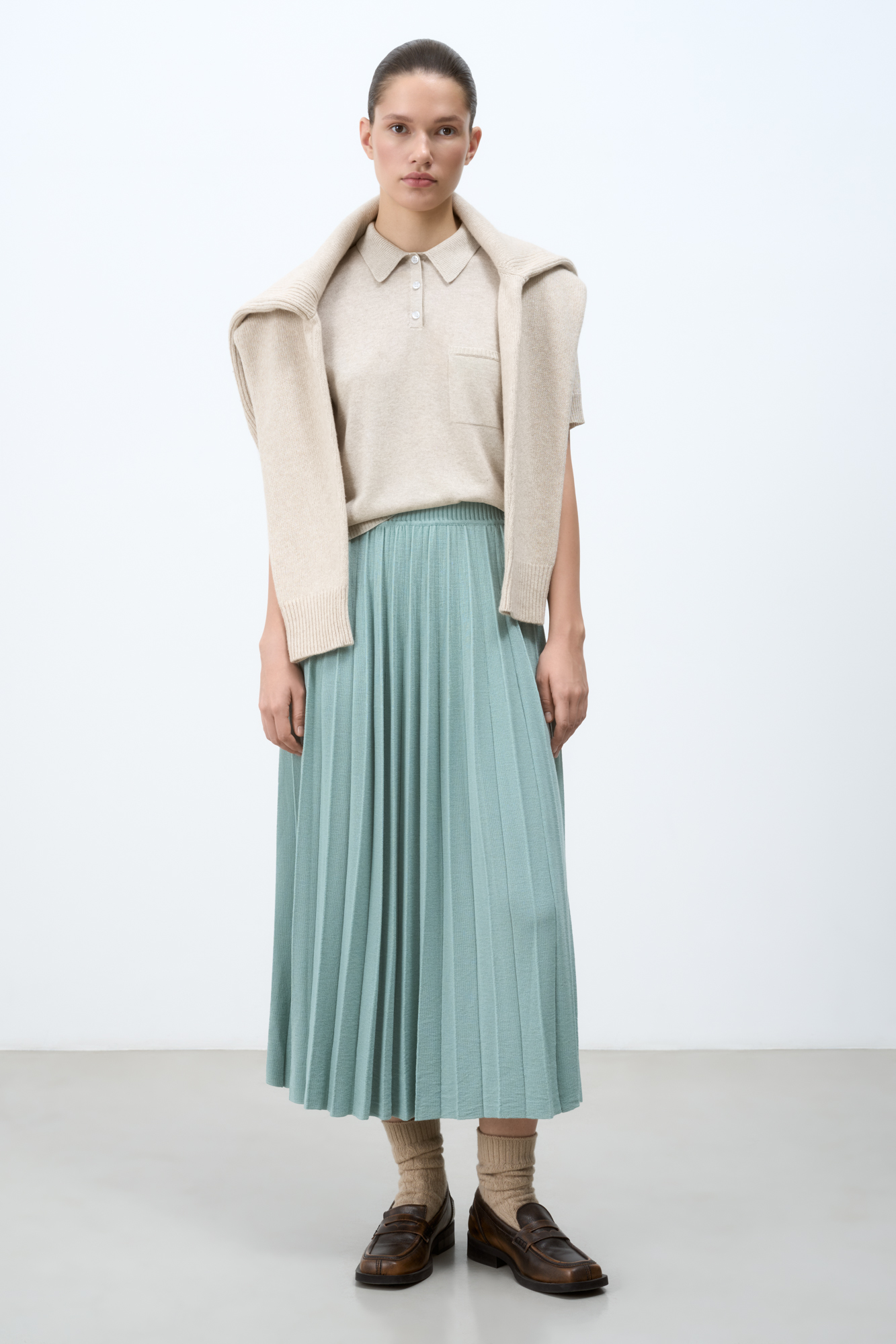 Трикотажная юбка плиссе из шерсти мериноса. Модель А-силуэта с широким эластичным поясом. Изделие без подкладки.