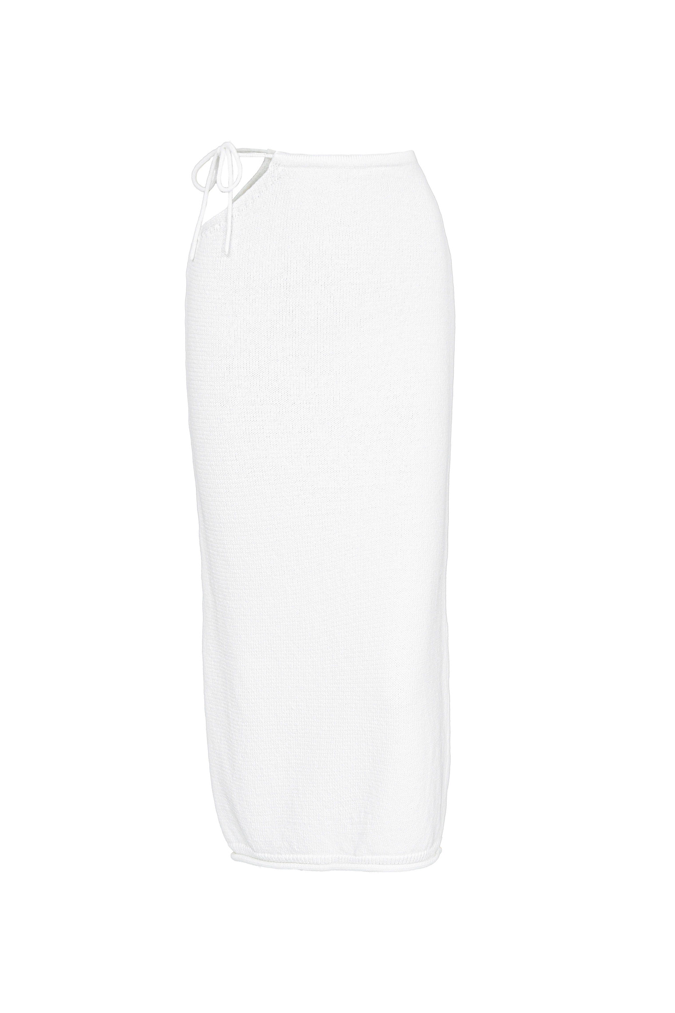 Трикотажная юбка миди из 100% хлопка. Модель по фигуре, с вырезом сбоку, шнурком-завязкой на талии и валиком по низу изделия. Дополнить образ можно топом на одно плечо.