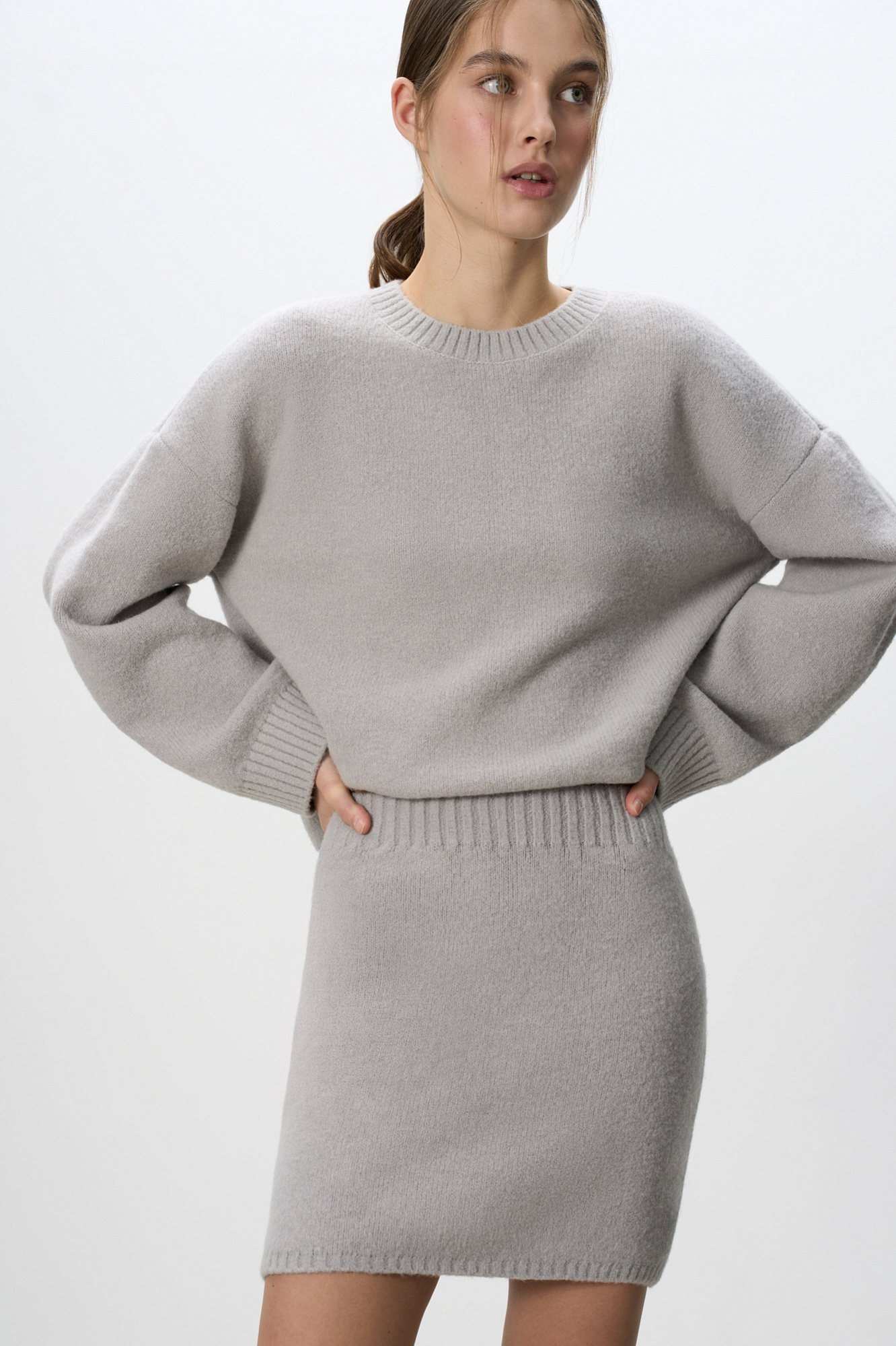 Трикотажная юбка длины мини из смесовой шерсти с добавлением мохера. Модель приталенного силуэта с эластичным поясом в рубчик.