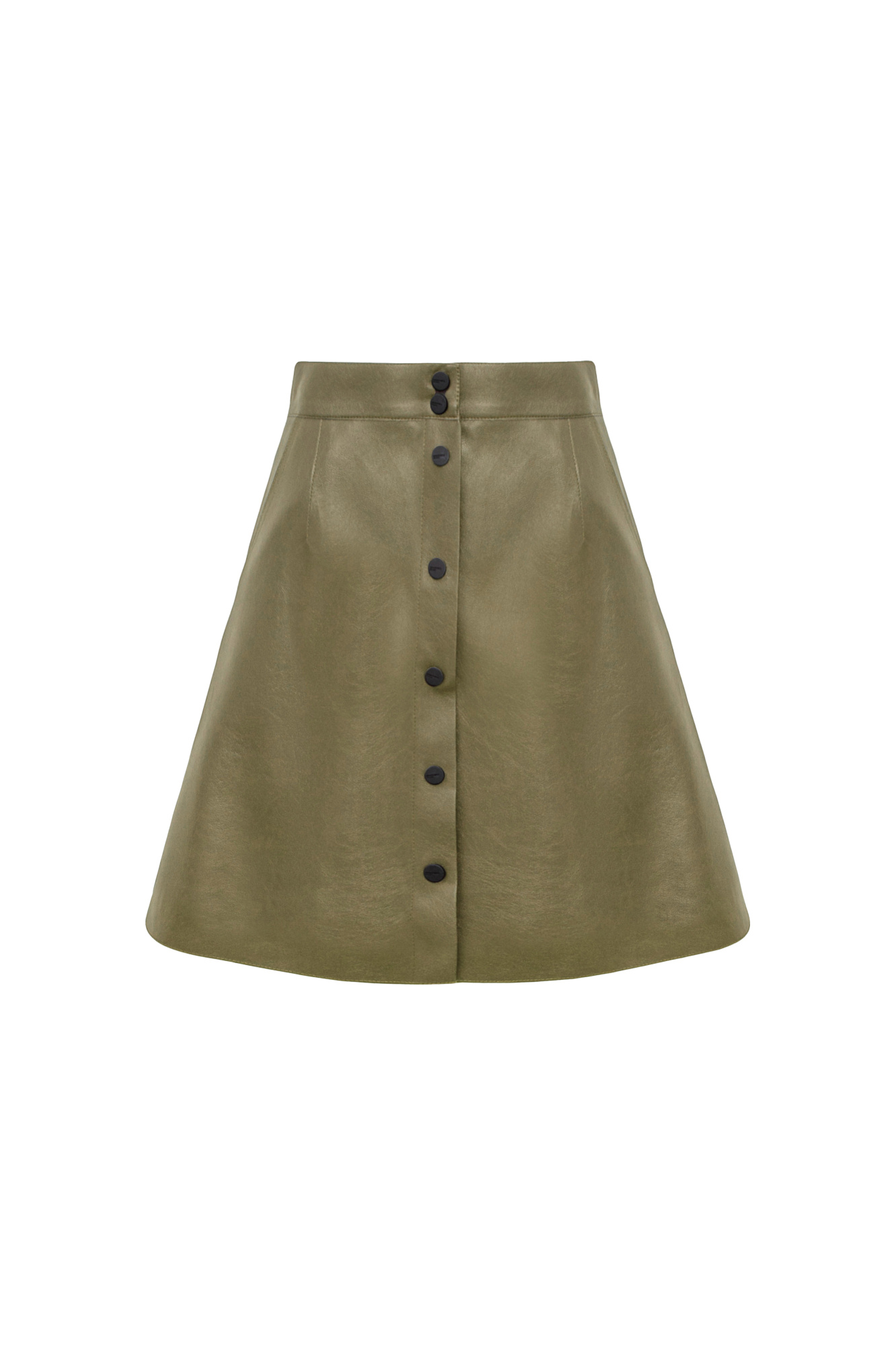 Мини-юбка из двусторонней экокожи с застежкой на пуговицы. Модель трапециевидного силуэта без подкладки.
