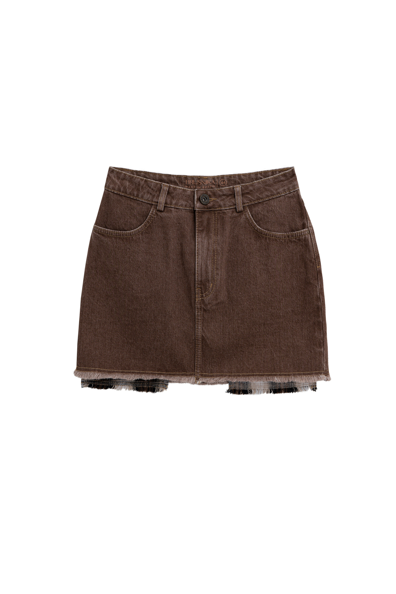 Джинсовая юбка длины мини из 100% хлопка. Модель декорирована бахромой по нижнему краю и имитацией подкладки из клетчатой ткани. Шлевки на поясе для ремня и застежка на молнию и пуговицу. 4 кармана.
