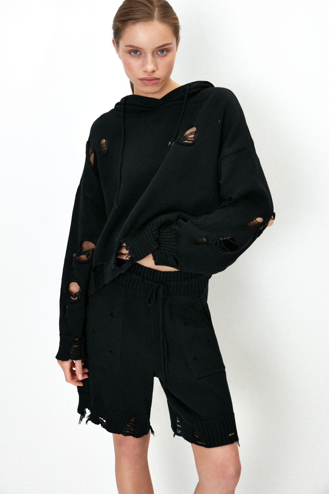 Трикотажные шорты из 100% хлопка с рваной текстурой и эластичным поясом на кулиске. Дополнить образ можно джемпером в таком же стиле.