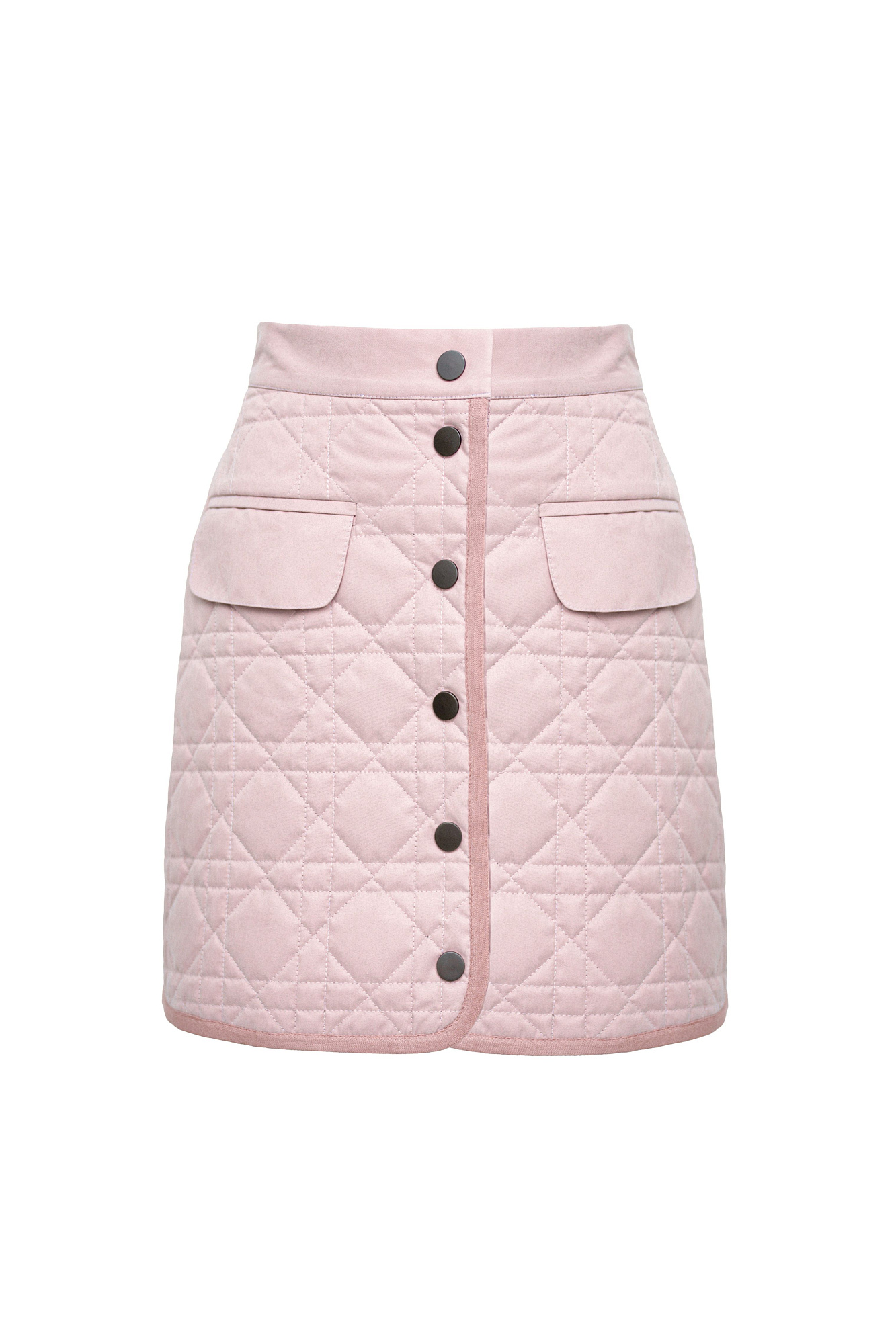 Стеганая юбка длины мини. Модель приталенного силуэта с карманами спереди, застежкой на кнопки и эластичным поясом.