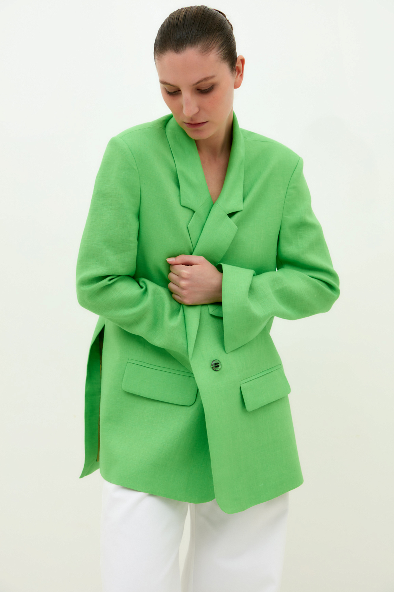 Классический жакет из 100% льна с разрезами по бокам и накладными карманами. Застежка на одну пуговицу. Изделие на подкладке.