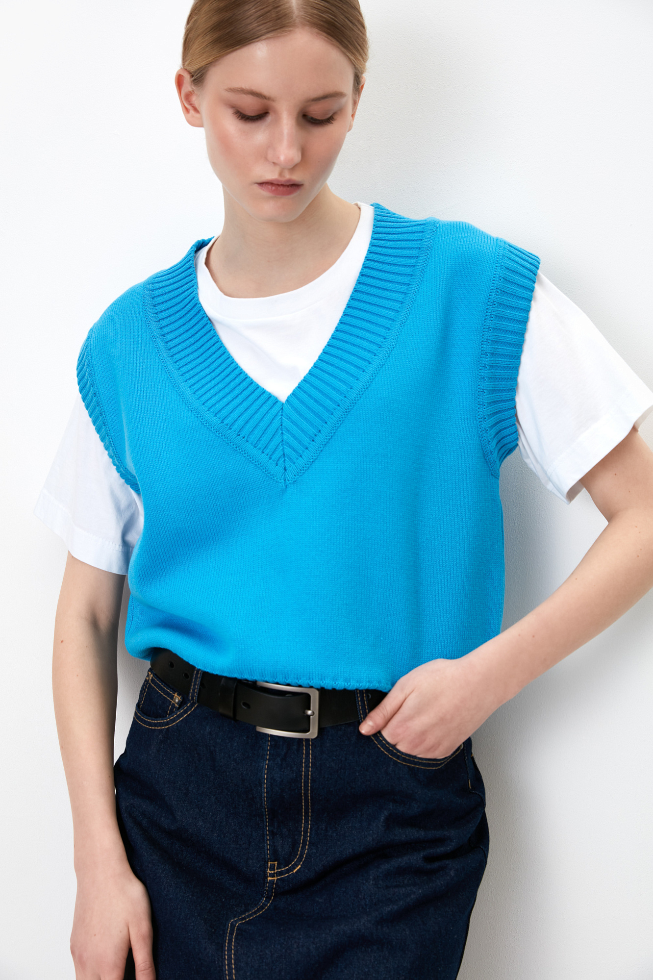 Жилет из 100% хлопка с V-вырезом и широкой проймой. Низ на резинке.