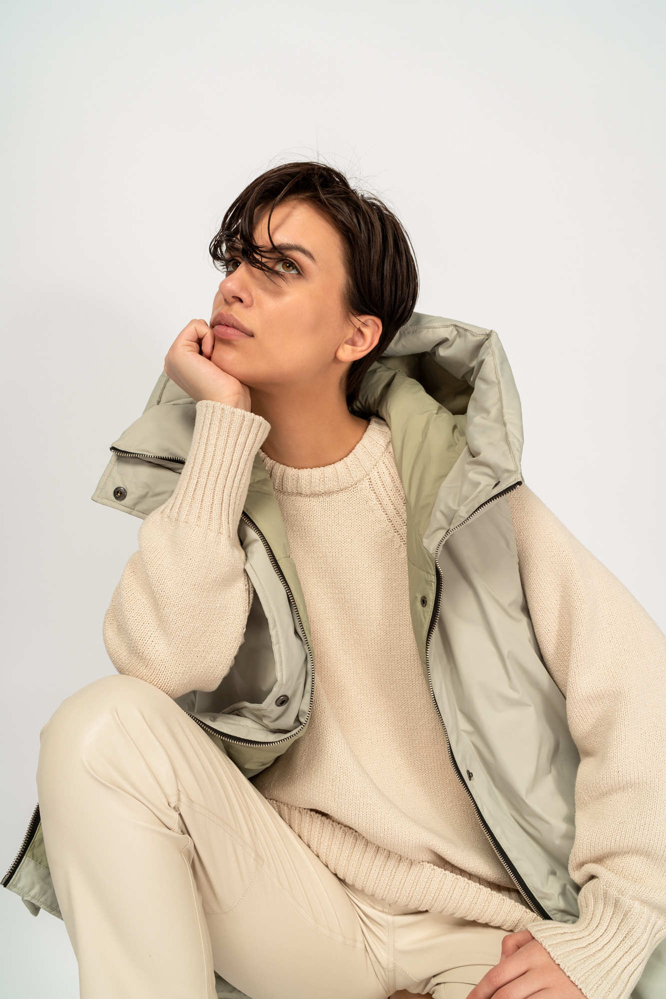 Объемный жилет с капюшоном. Модель на подкладке, утеплитель пух-перо. Застежка выполнена на молнию и потайные кнопки.
