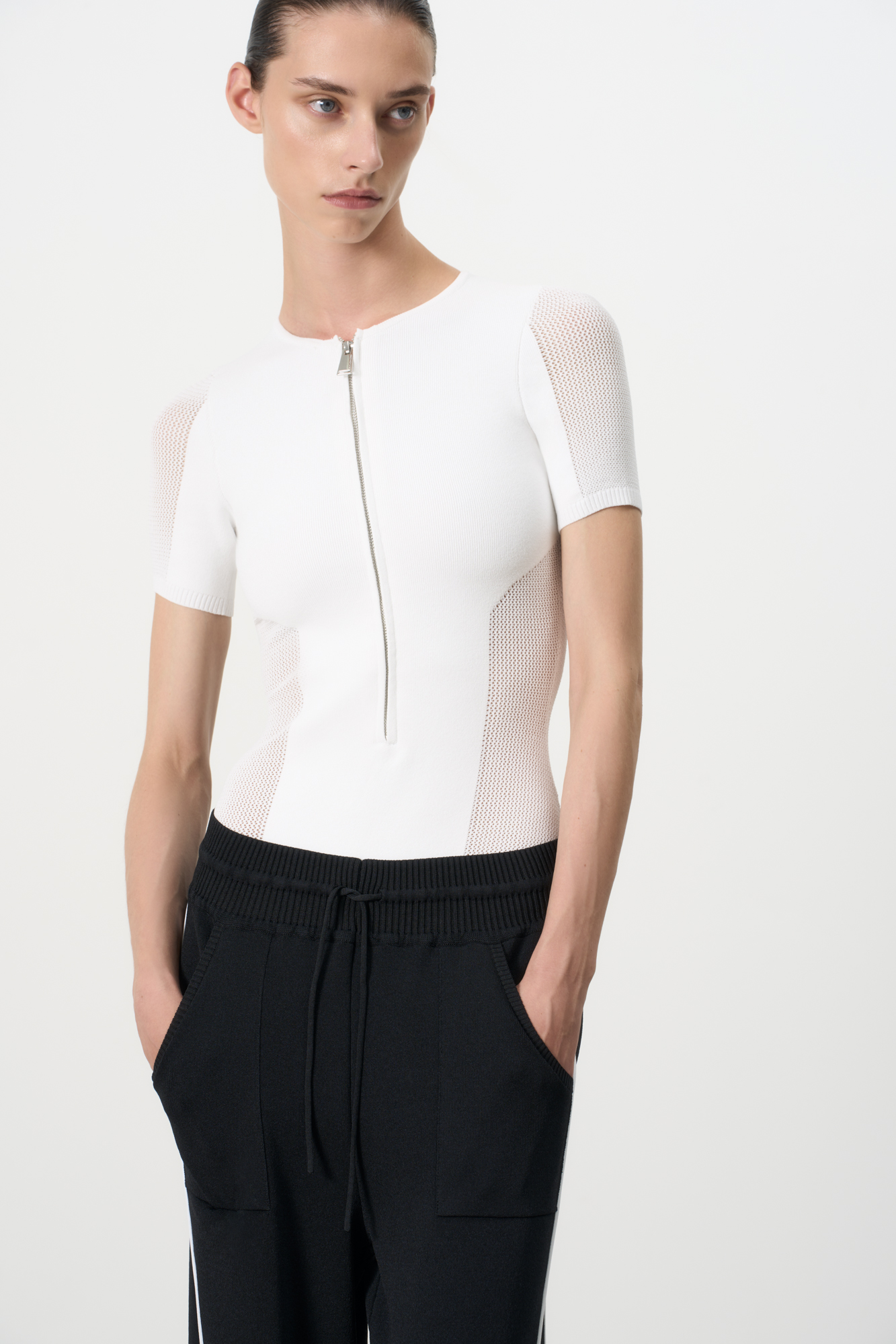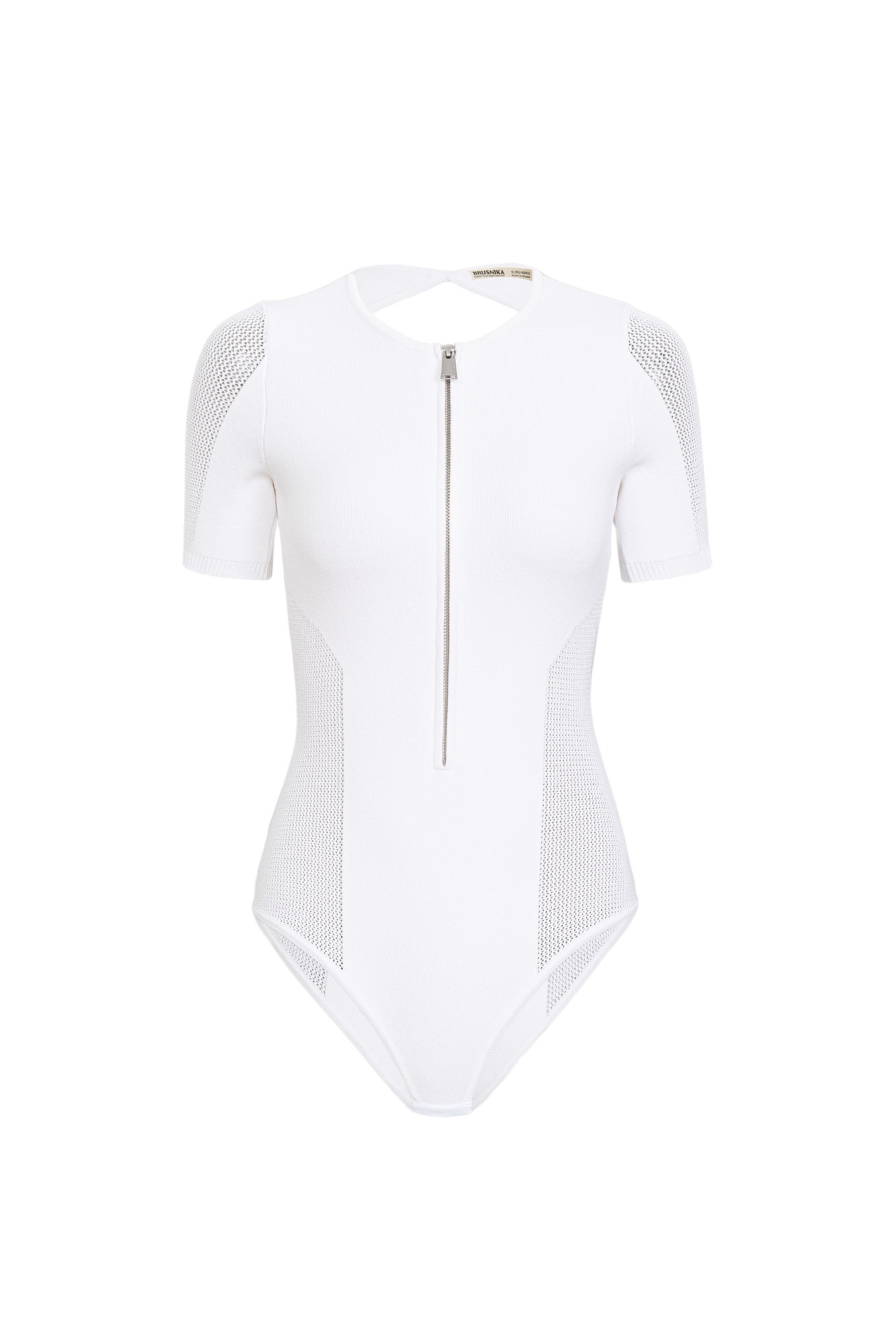 Трикотажное боди из вискозы. Модель с короткими рукавами, застежкой на молнию спереди и вырезом на спине. При изготовлении изделия используется комбинированная вязка: гладью в мелкий рубчик и сетку. Застежка на бельевые крючки.