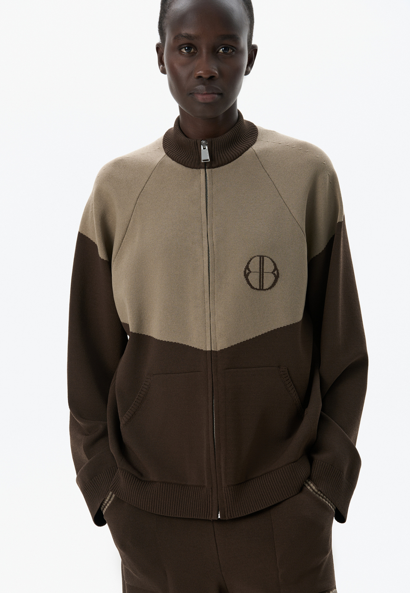 Трикотажный бомбер из вискозы с добавлением эластана. Модель прямого силуэта, с рукавом реглан, невысоким воротником-стойкой и боковыми карманами. Изделие декорировано брендированным жаккардом на груди. Застежка на молнию.