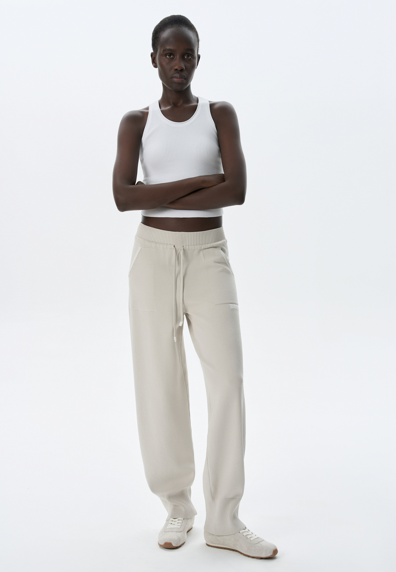 Трикотажные брюки из вискозы с добавлением эластана. Модель выполнена в спортивном стиле, с широким эластичным поясом на кулиске, боковыми карманами и широкими манжетами на резинке.