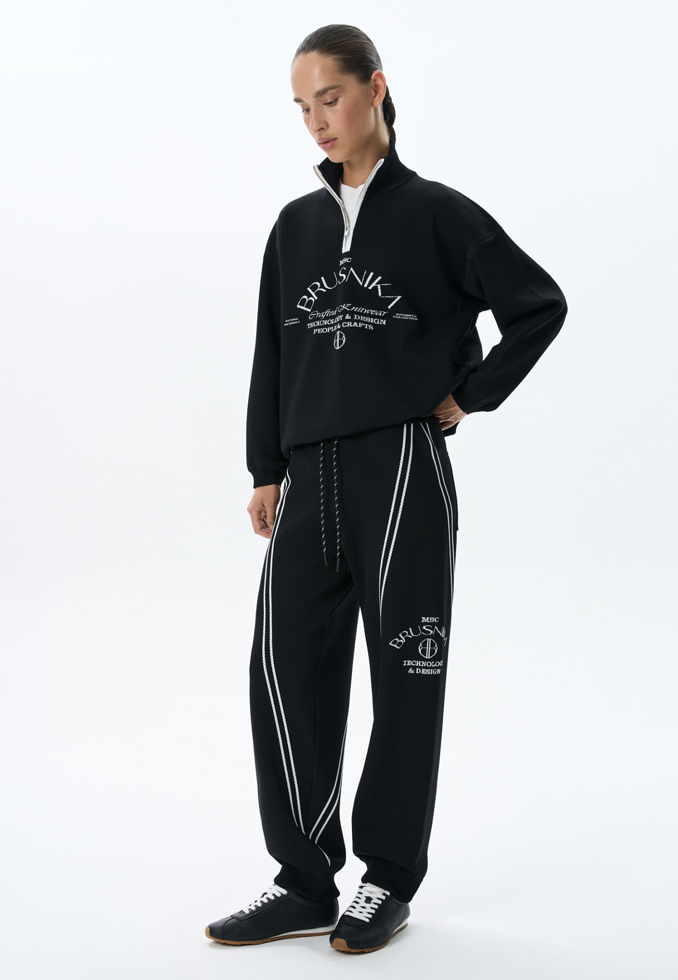 Трикотажные джоггеры из вискозы. Модель свободного силуэта, с широким эластичным поясом на кулиске, боковыми и задними карманами. Изделие декорировано брендированным жаккардом и лампасами контрастного цвета.