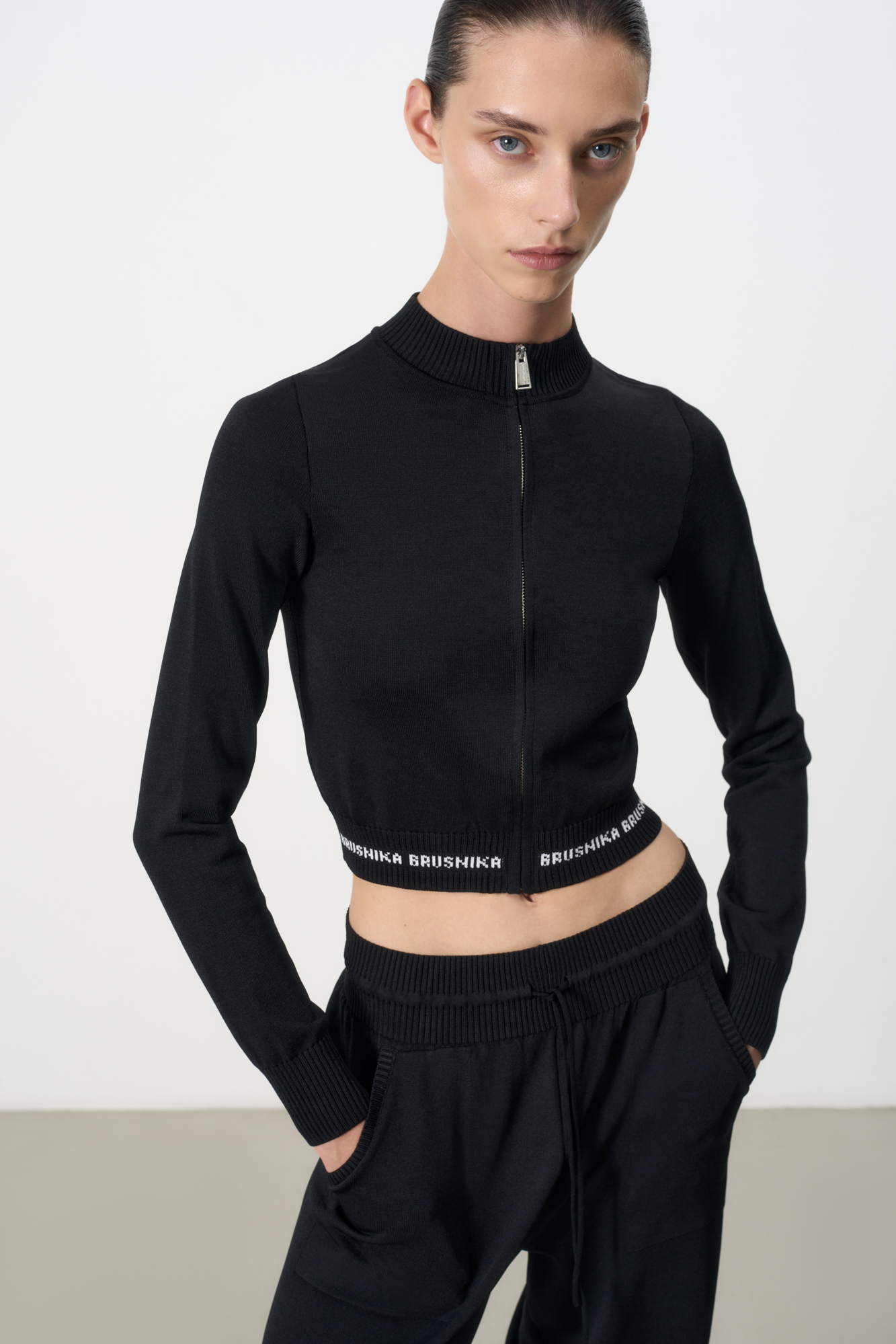Укороченный бомбер из вискозы с длинным рукавом. Воротник, манжеты рукавов и низ изделия выполнены в рубчик. Застежка на молнию.
