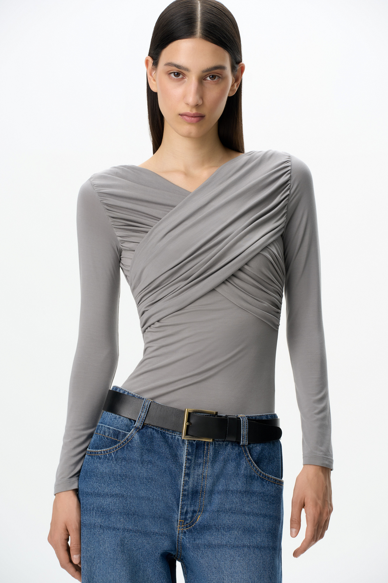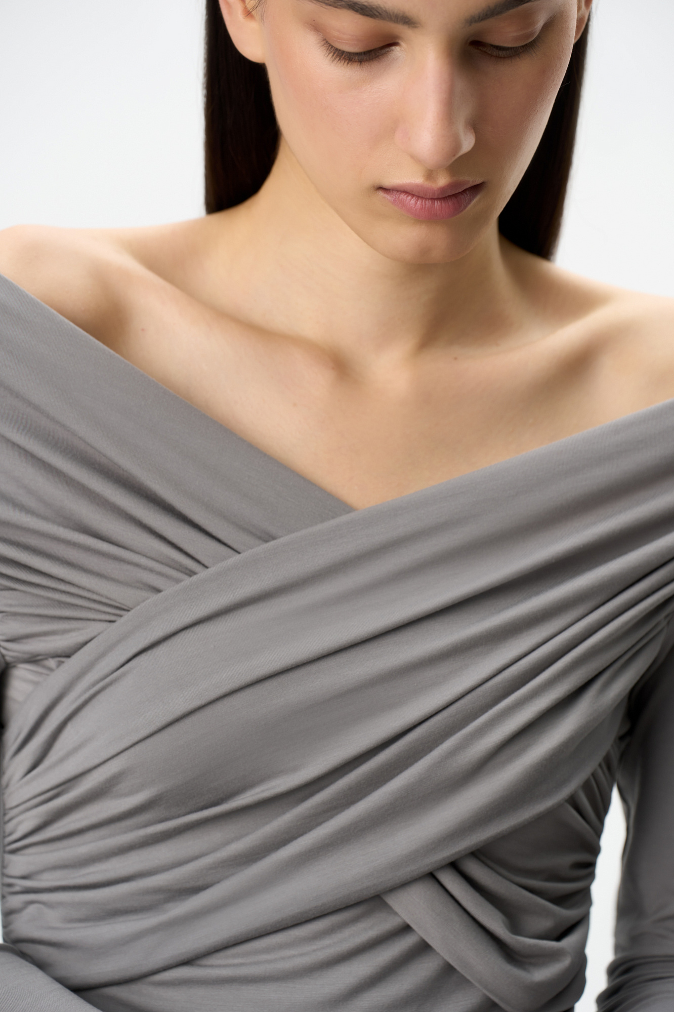 Удлиненный топ с драпировкой на груди. Модель приталенного силуэта с длинным рукавом, выполнена из мягкой и шелковистой ткани.