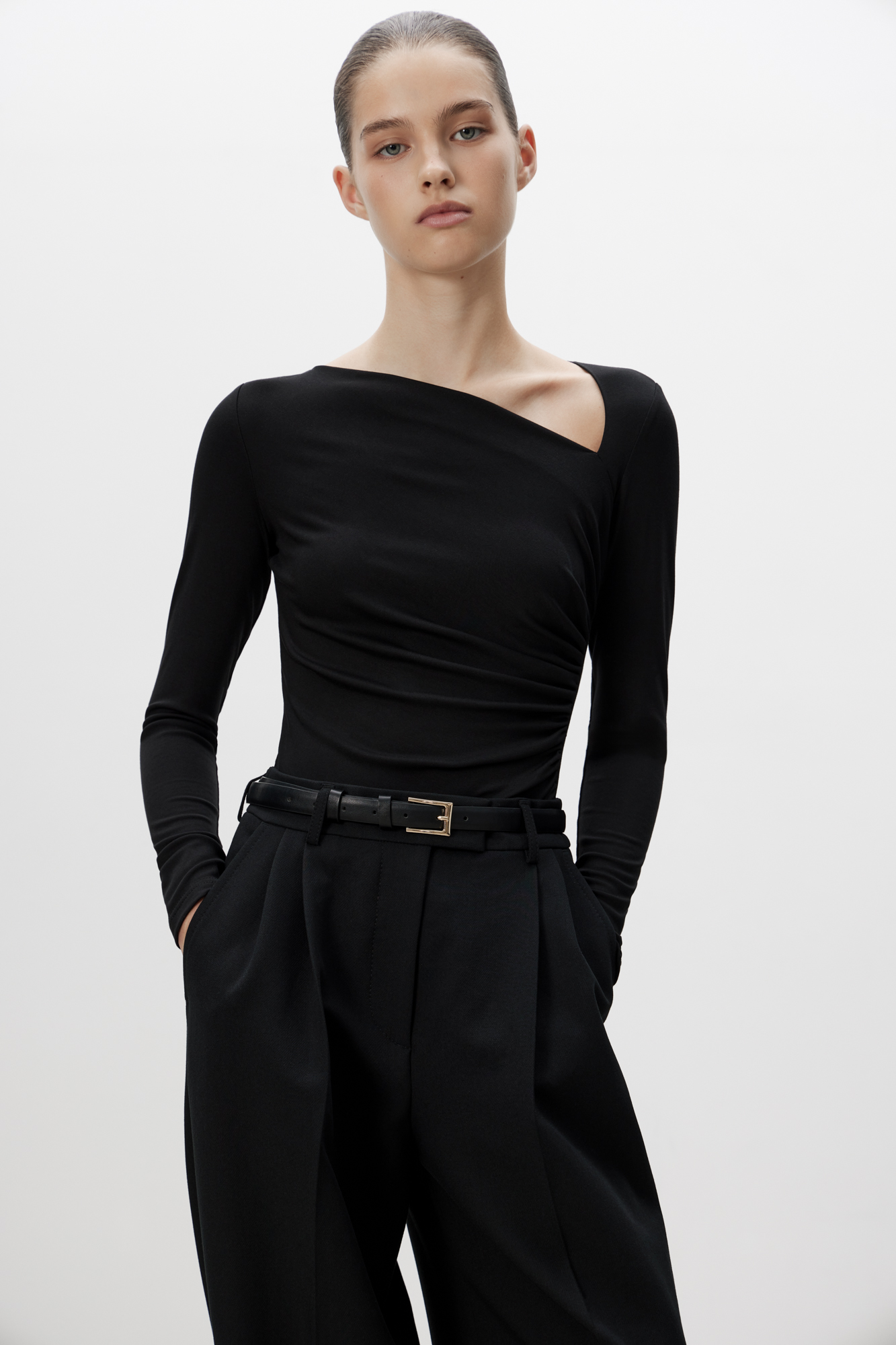 Лонгслив с асимметричным вырезом. Модель приталенного силуэта с драпировкой сбоку.