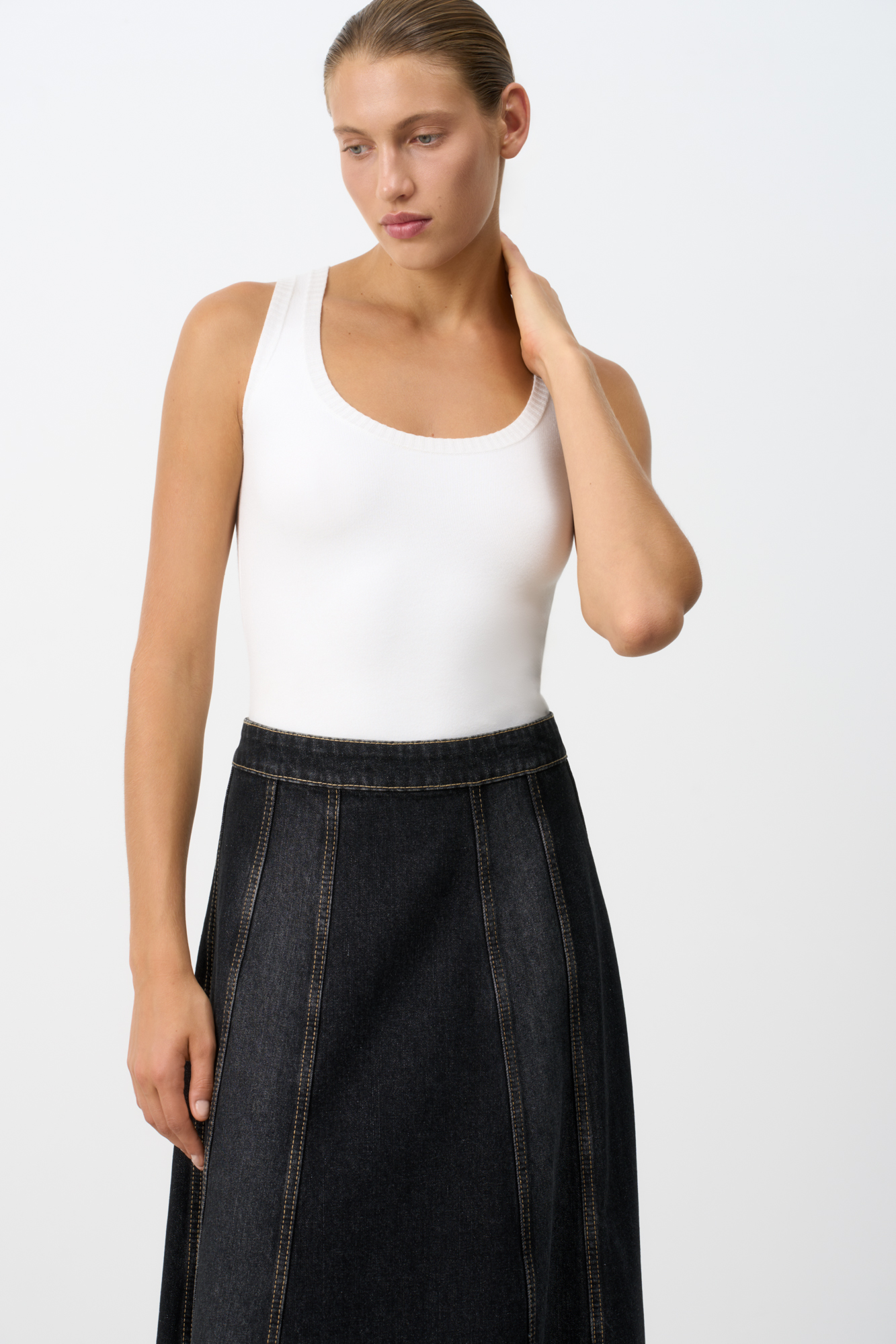 Удлиненная трикотажная майка из вискозы c круглым вырезом и открытыми плечами.