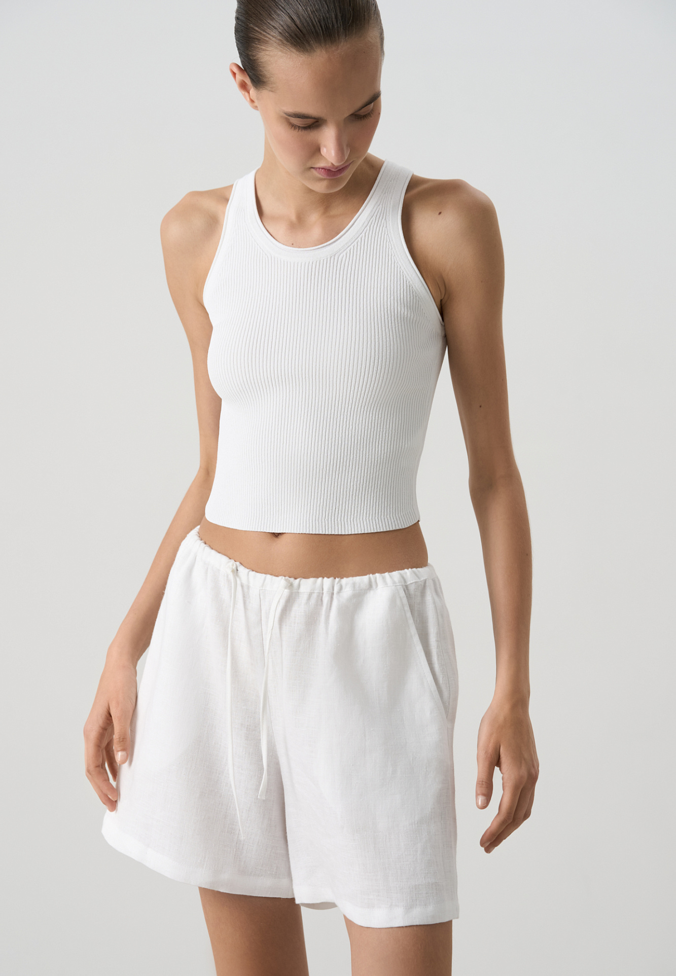 Трикотажная майка из вискозы в рубчик. Модель с глубокой проймой, арочным низом и U-образным вырезом горловины с валиком.
