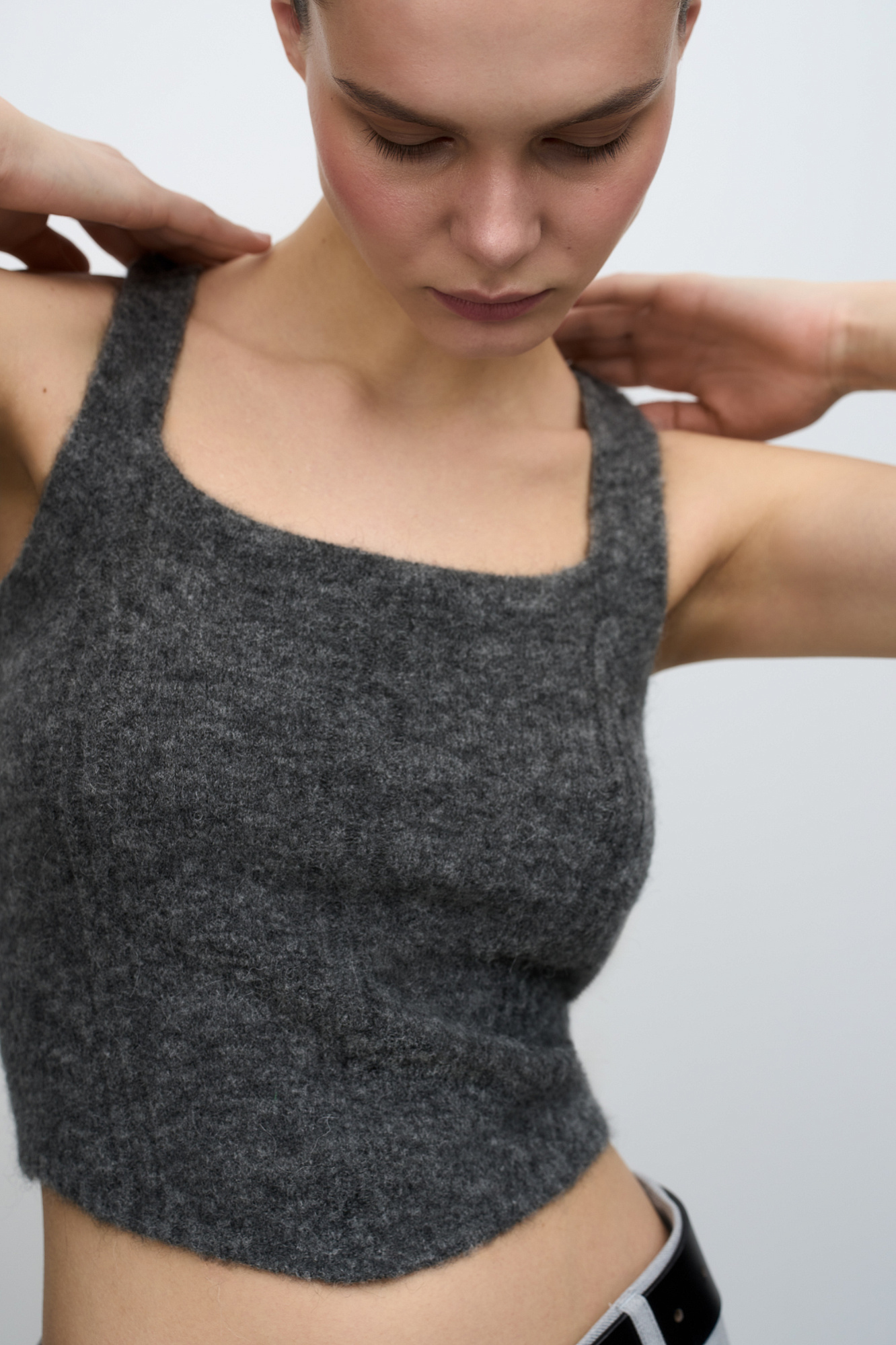 Трикотажный укороченный топ из шерсти альпака. Модель на бретелях. Дополнить образ можно кардиганом из того же материала.